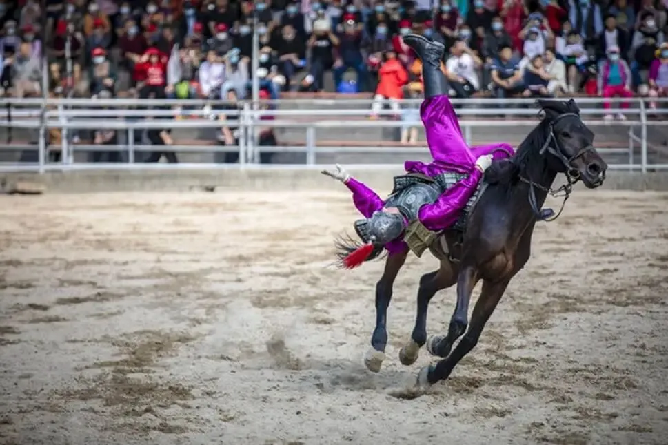 演出开始时,每位“武将”都会轮番出场,来展示自己的马上绝技,若是没有扎实的基本功,一定无法完成这些高难度的动作。