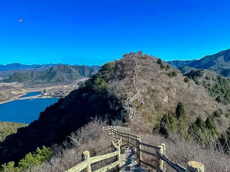 该条线路比较简单,老少皆宜,特别适合新人体验。前一小段是干净平坦的石板路,然后经过不高的登山石阶,半小时便能到达山脊,大多时间我们都是行走在山脊线上,脚下就是金海湖,视野开阔,景色壮观绝美,后半段我们沿着水边走的蜿蜒石子路和沙滩行走,最后穿越小树林返回栈道下山沿公路返回。