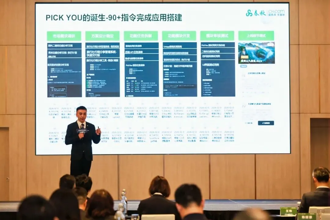 春秋集团信息技术部总经理时珠荣先生系统分享了春秋旅游在AI工程化应用方面的前沿探索。他展示了一系列落地成果:AI产品工厂让一个员工即可上线8000条产品,行程录入从30分钟缩短至5分钟;自主研发的智能旅游营销平台“PICK YOU”支持一键导入行程、智能生成多媒体内容、全链路数据追踪,让分享裂变可监测、可复盘。他强调,春秋正以“技术筑基,AI为翼”,让每一个服务触点都成为“价值感知”的放大器。