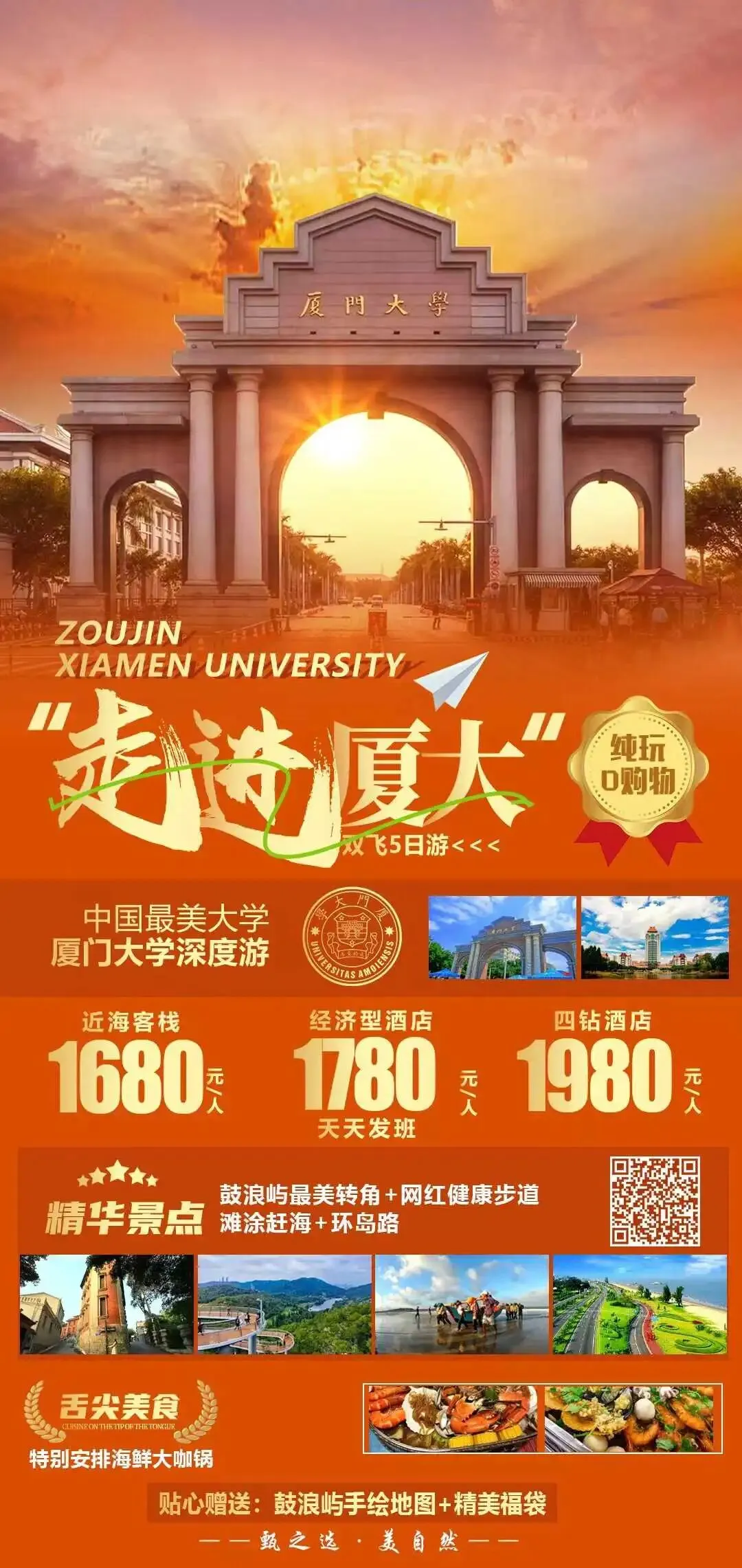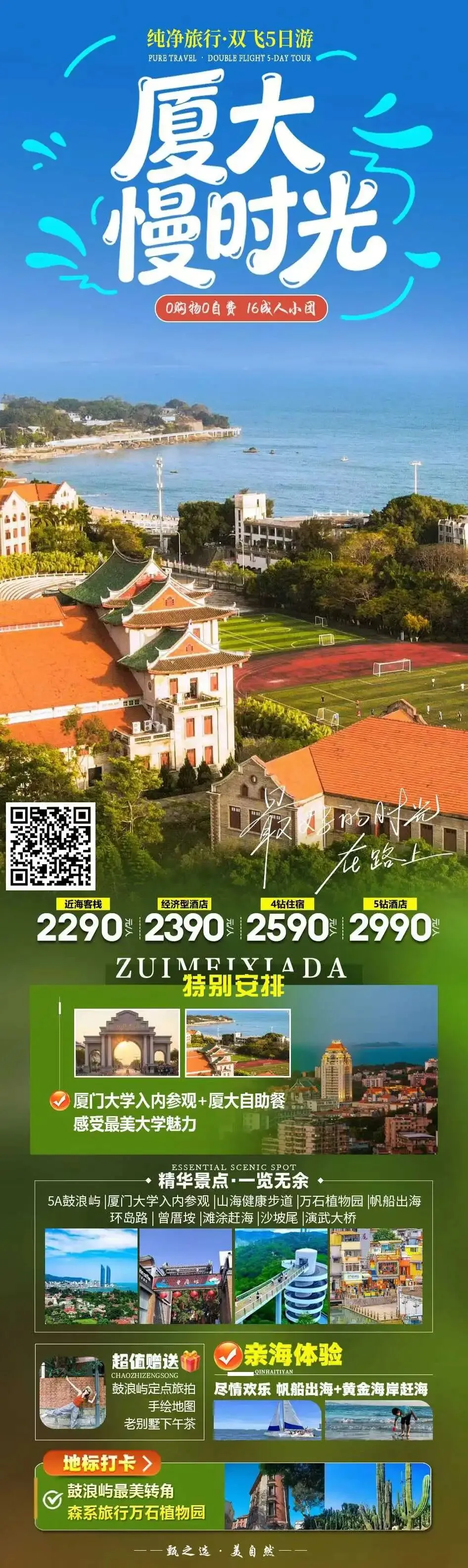 春风和煦,正是厦门最美时节。漫步鼓浪屿,听琴音绕巷,赏百年风情;骑行环岛路,看碧海蓝天,繁花似锦;逛老街古厝,品地道闽南风味。风光宜人,行程舒适,一路皆是治愈风景。不负春光,不负山海,邀您共赴厦门,邂逅一场诗意与浪漫的海边之旅。