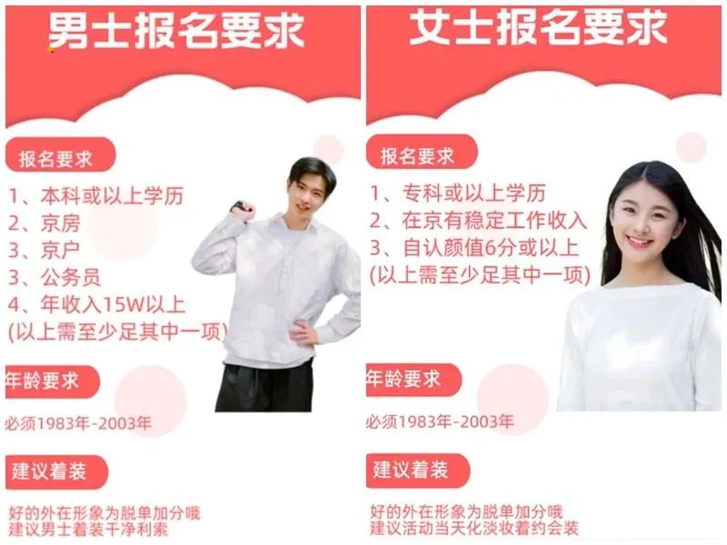 ②、【男士报名要求】(需至少足其中一项):本科及以上学历 or 京房 or 京户 or 公务员 or 年收入≥15W;【女士报名要求】:专科及以上学历;
