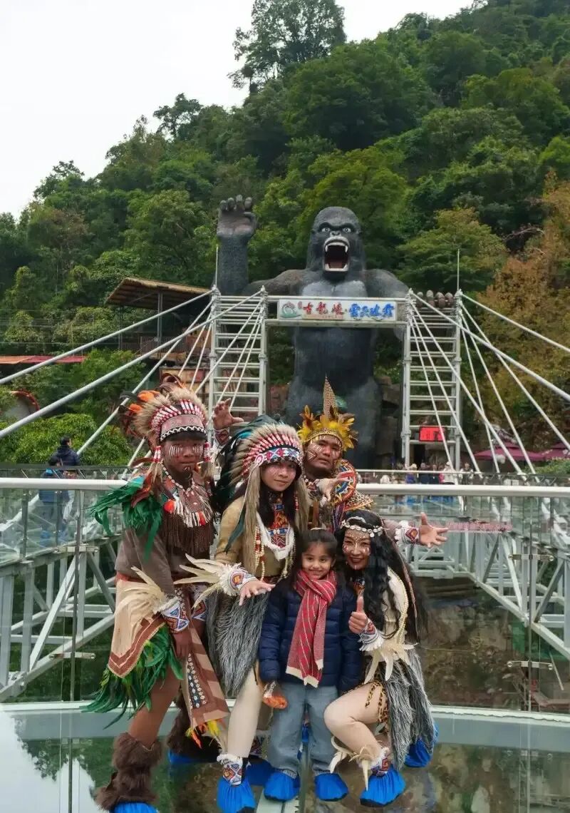 清远古龙峡景区游客与“部落野人”合影。 南方都市报