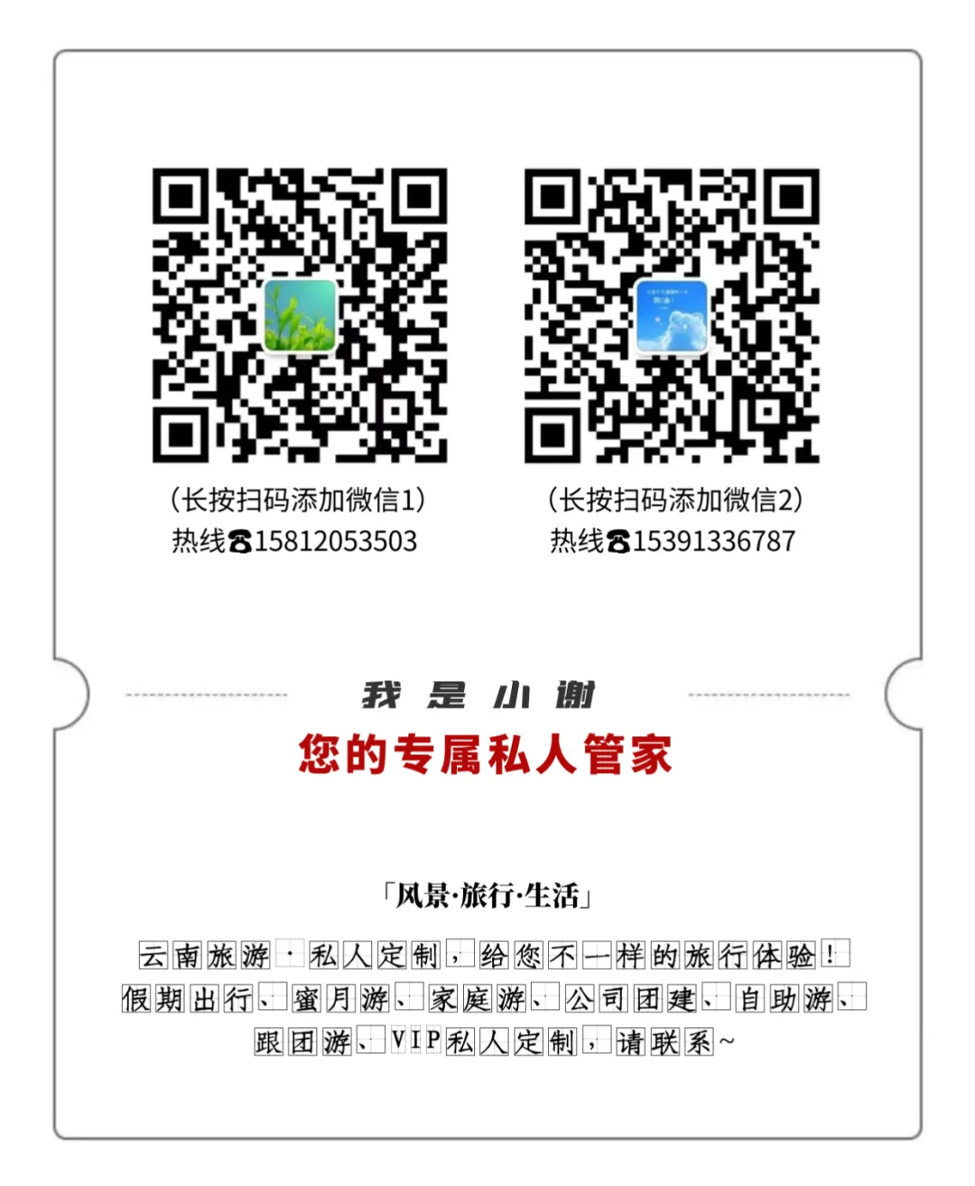 一次愉快的旅行,必定少不了一位专业负责的行程管家。如果你也打算去云南,请扫描下方二维码添加小谢,免费为你定制行程、解锁云南旅游新方案~