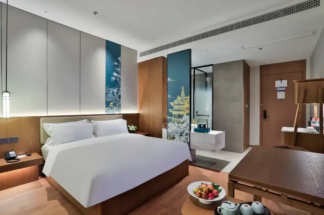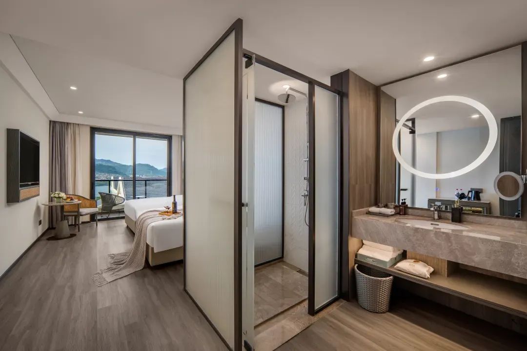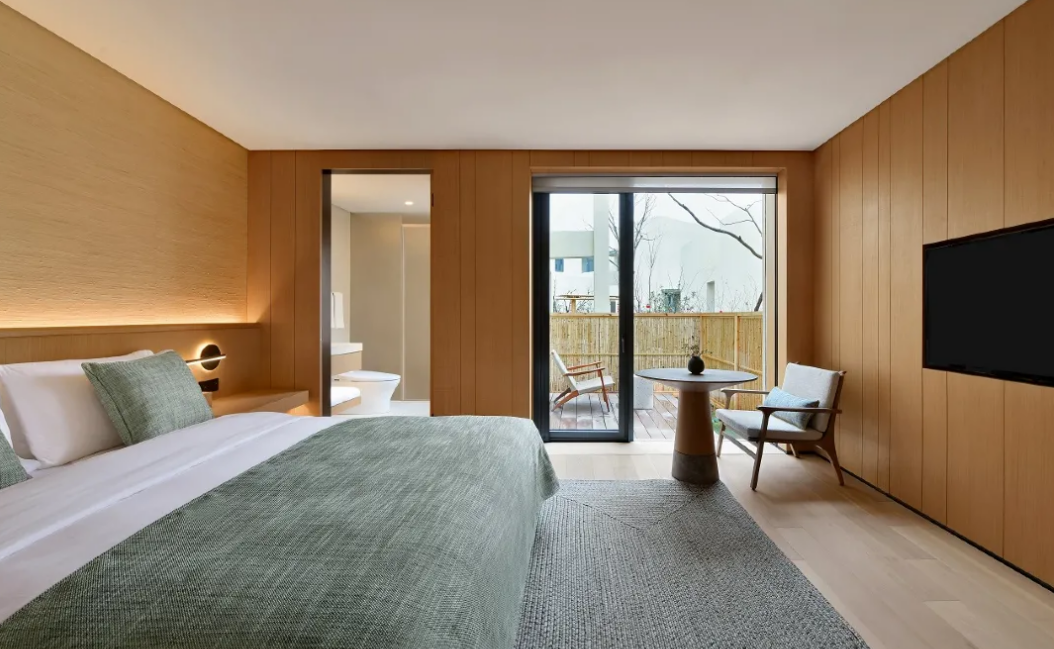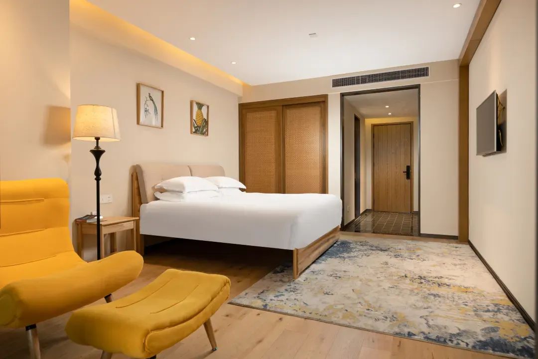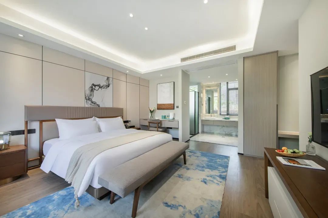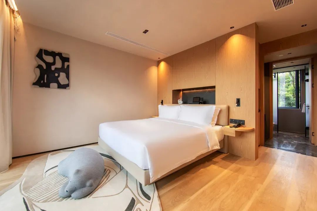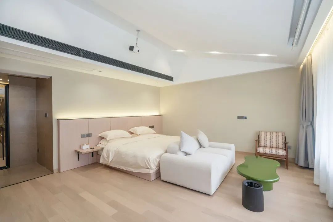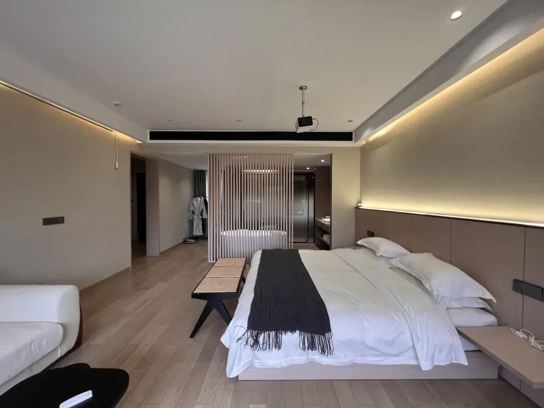 屋内的空间也足够宽敞,40㎡起跳的面积,度假体验感拉满。房间的整体装修雅致简洁,自然相贴。