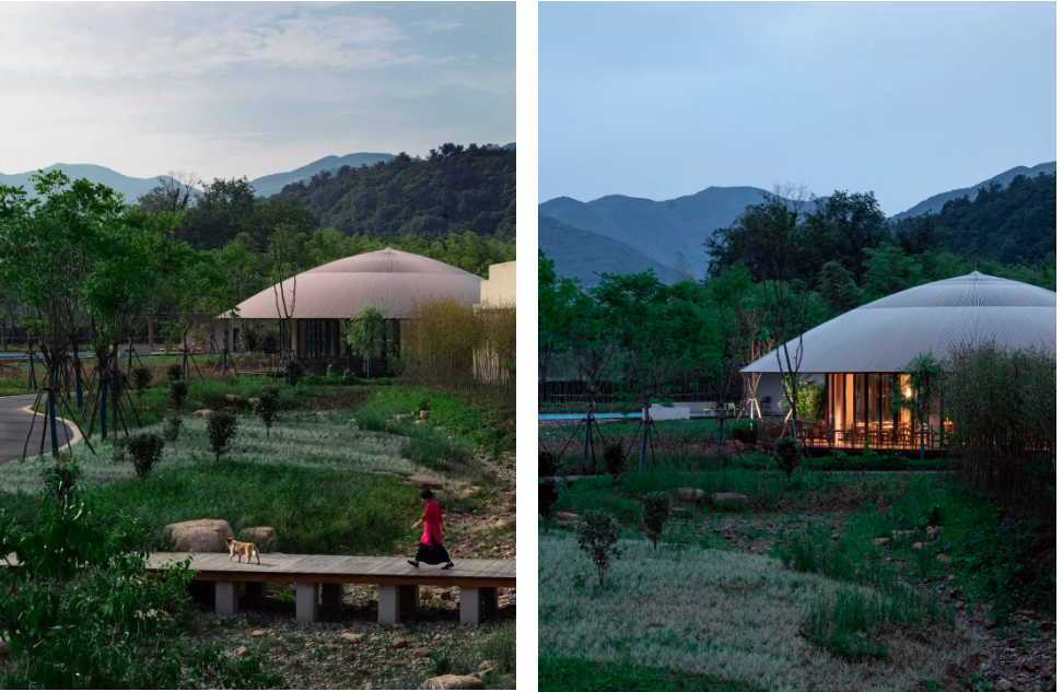 安吉离城开元度假酒店隐于竹林,仿佛星星点点散落其间,但视线开阔,一览众山小。水系、植被丰富,山涧水流贯穿其间。
