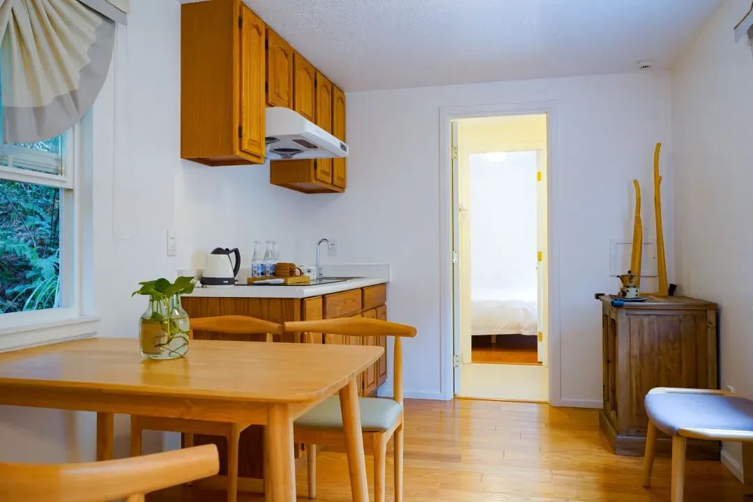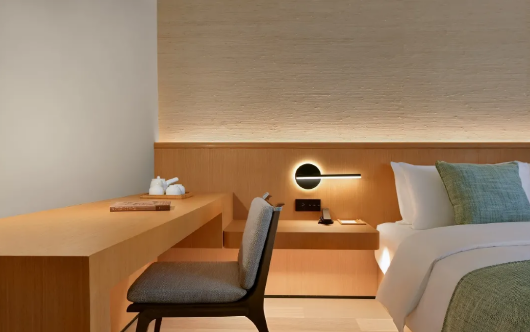 整体为原木MUJI风,如无印良品般质感十足,内部还印有花间堂logo的茶具和茶叶免费享用。