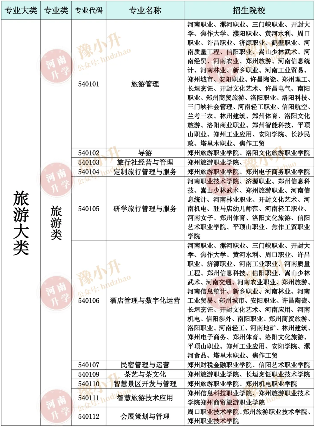 河南高职单招旅游大类包含以下专业: