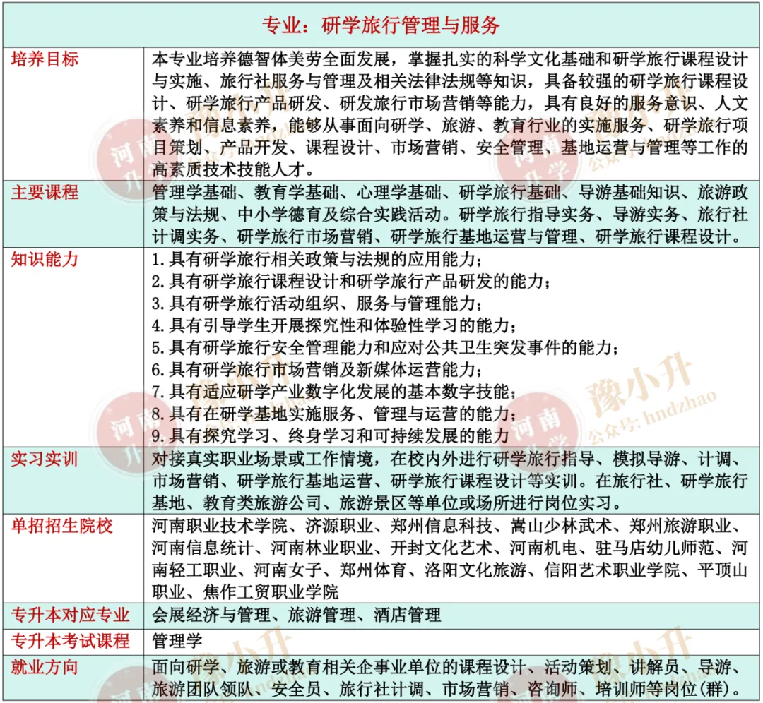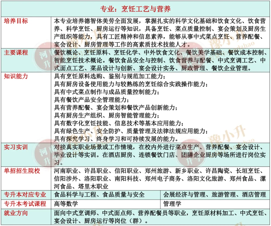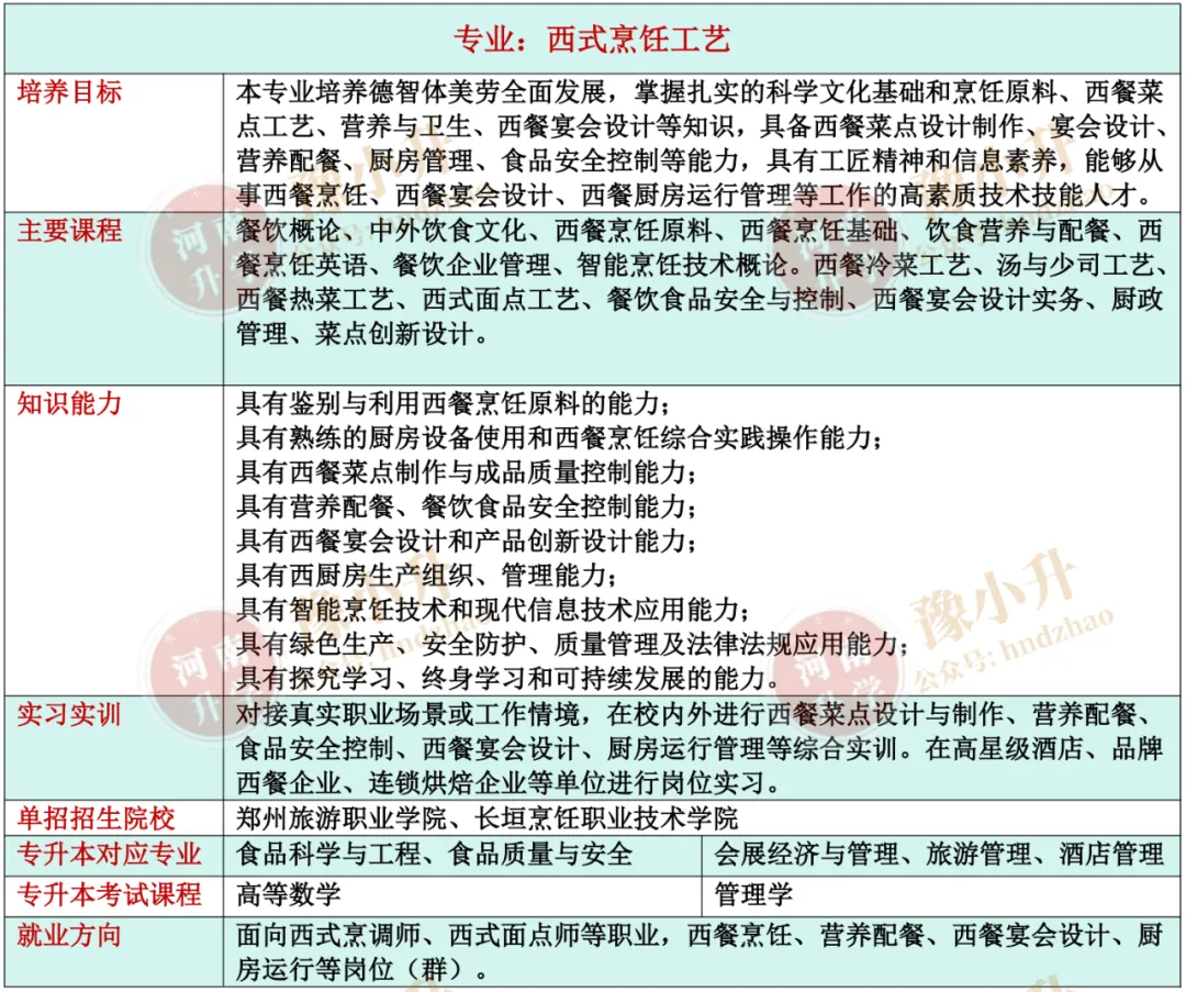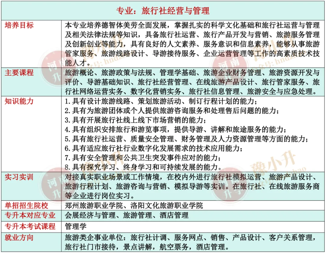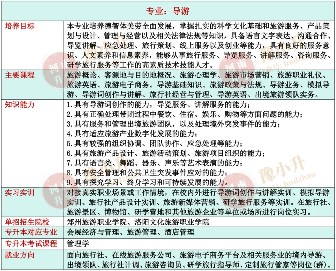 河南单招专业详解 旅游大类(含旅游类、餐饮类)各专业招生院校、升本专业、就业方向、开设课程、培养目标