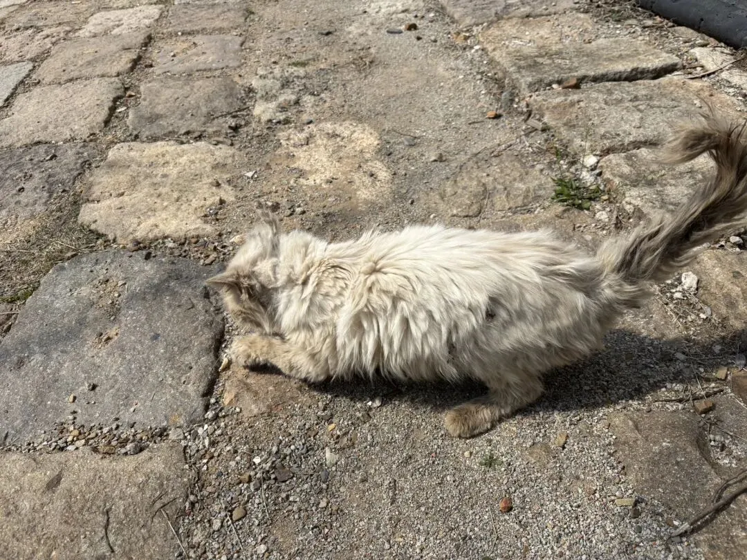 这只流浪猫应该是蓝金渐层,是品种猫是被遗弃的,小鱼给喂了鸡块和水,吃得飞快,太可怜了!品种猫被遗弃了很难生存。前主人怎么这么忍心弃养,难受了好半天。