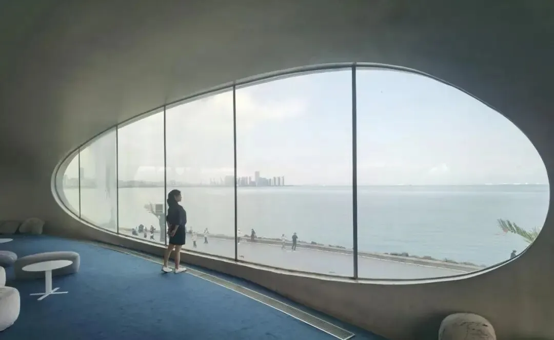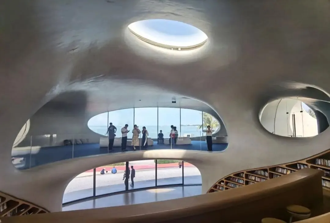 据说图书馆的设计灵感来自虫洞。开放式的外观给了我视觉上的冲击。“自然与建筑的有机融合”是她的设计理念。“消失的边界与流动的空间”“生物洞穴般的自然采光”“引景入室的观海窗洞”“混凝土的漫反射效果”“随时间变幻的光影艺术”是她的五大特点。这些是我AI寻得的。