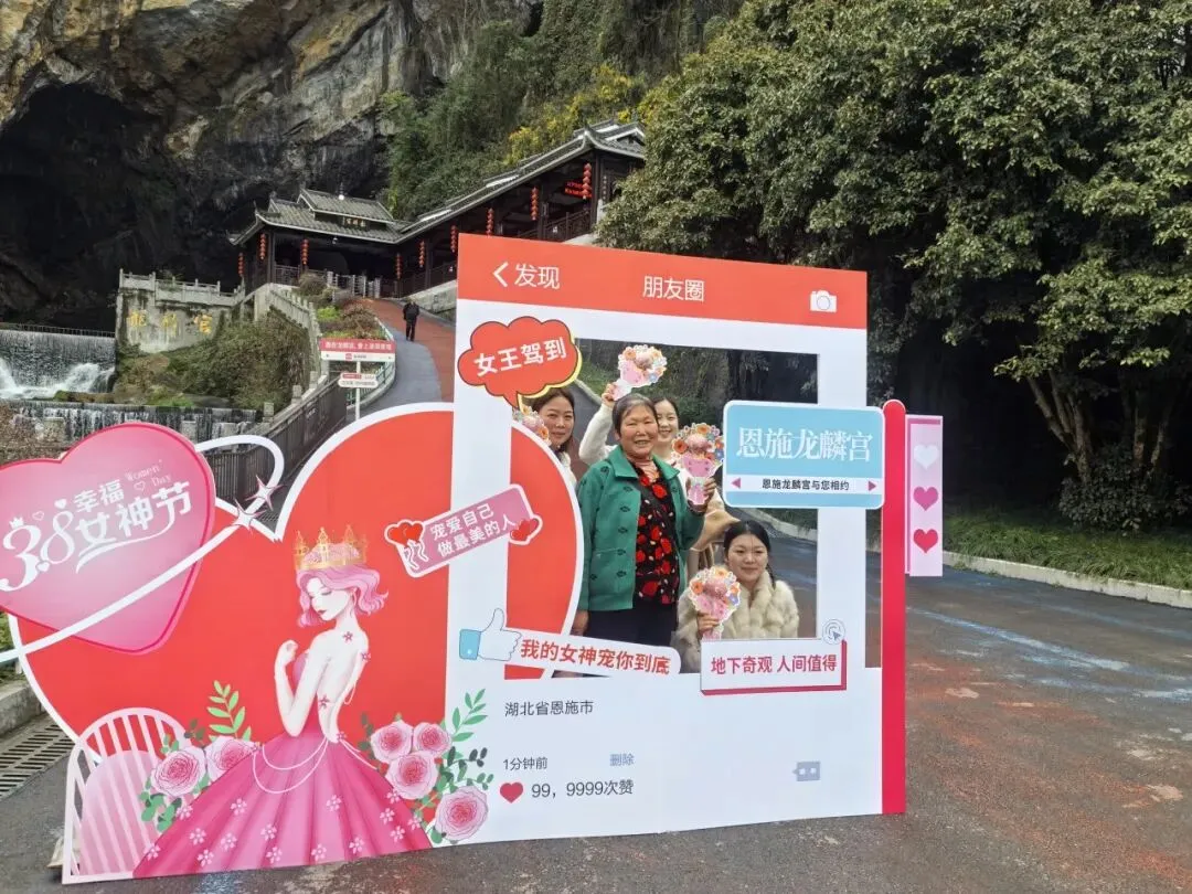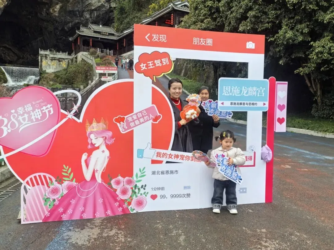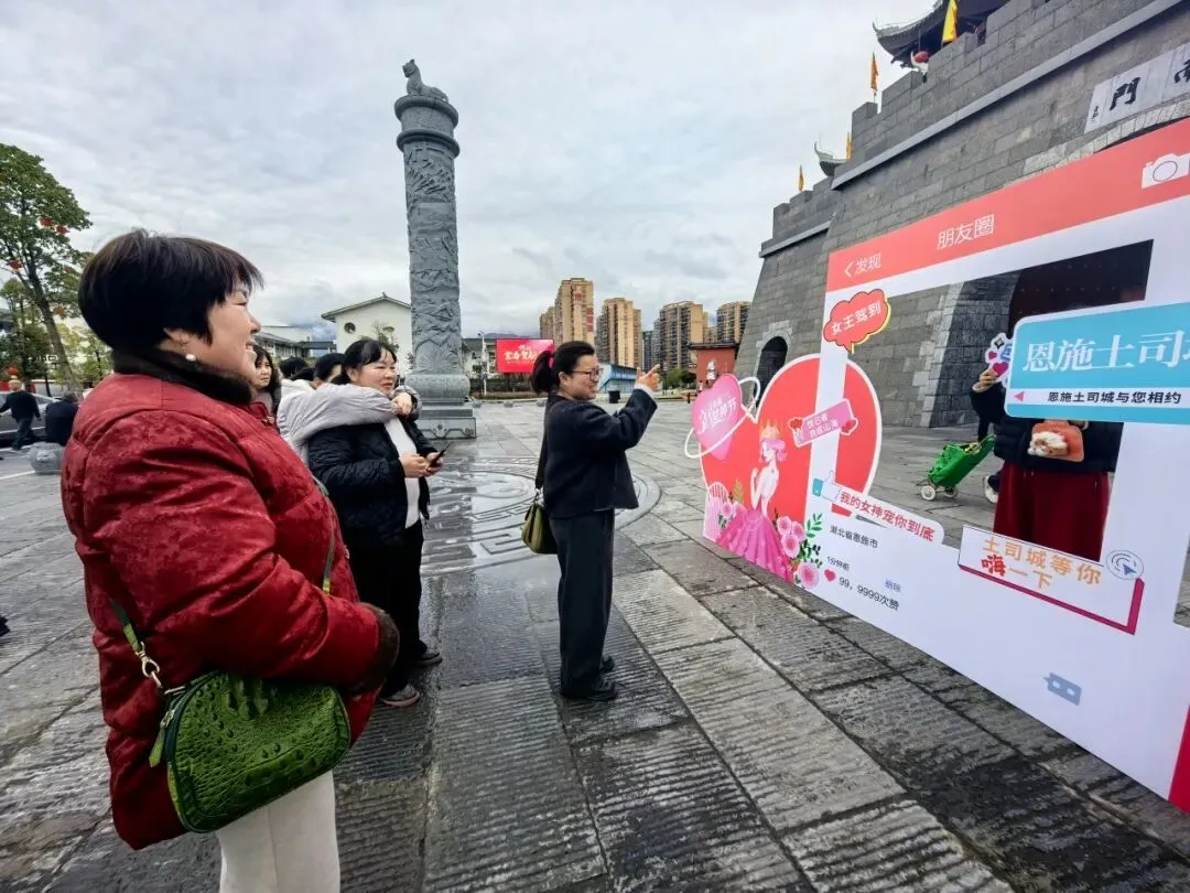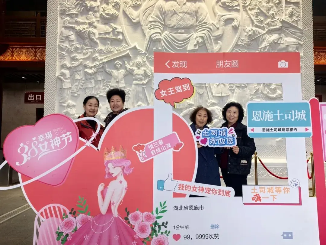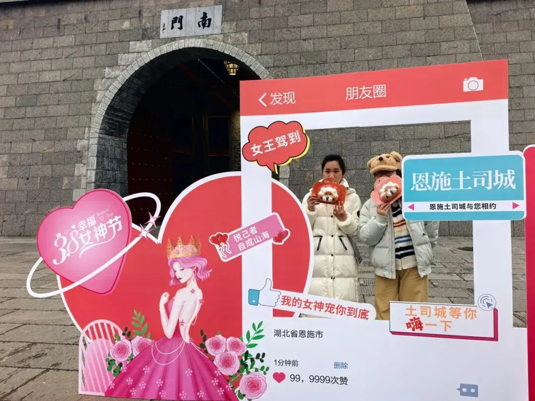 为定格最美瞬间,景区在核心观景位精心设置“3·8女神节·我在恩施土司城/龙麟宫”专属打卡框,成为全场人气焦点。土司城九进堂的雕梁画栋旁、龙麟宫浮桥秘境的水光山色间,女神们驻足留影,快门声此起彼伏,随手一拍便是氛围感大片。大家在朋友圈分享这份美好,让恩施的春日与节日喜悦,传递到更多角落。前100名完成打卡并分享朋友圈的女神,凭记录领取神秘礼品,惊喜与笑意写在每个人的脸上。一份小礼,承载着景区最真挚的节日祝福,让这份宠爱不止于风景,更有实实在在的温暖。