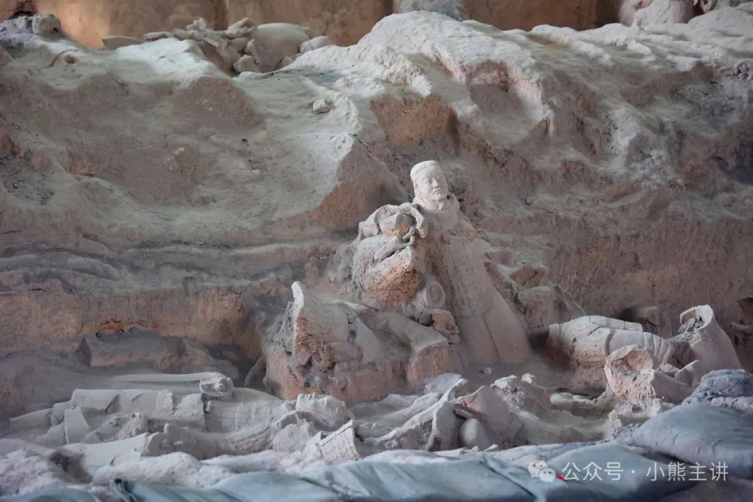一号坑:这是三个坑中面积最大、埋藏陶俑最多的一个,总面积约为14260平方米,主要是由步兵和战车组成,其中步兵俑约210余人,每排68人,前后左右成行,共计204人,组成方阵的后卫,坑的中间排列着有38路战车和步兵的纵队,组成军队的主体。