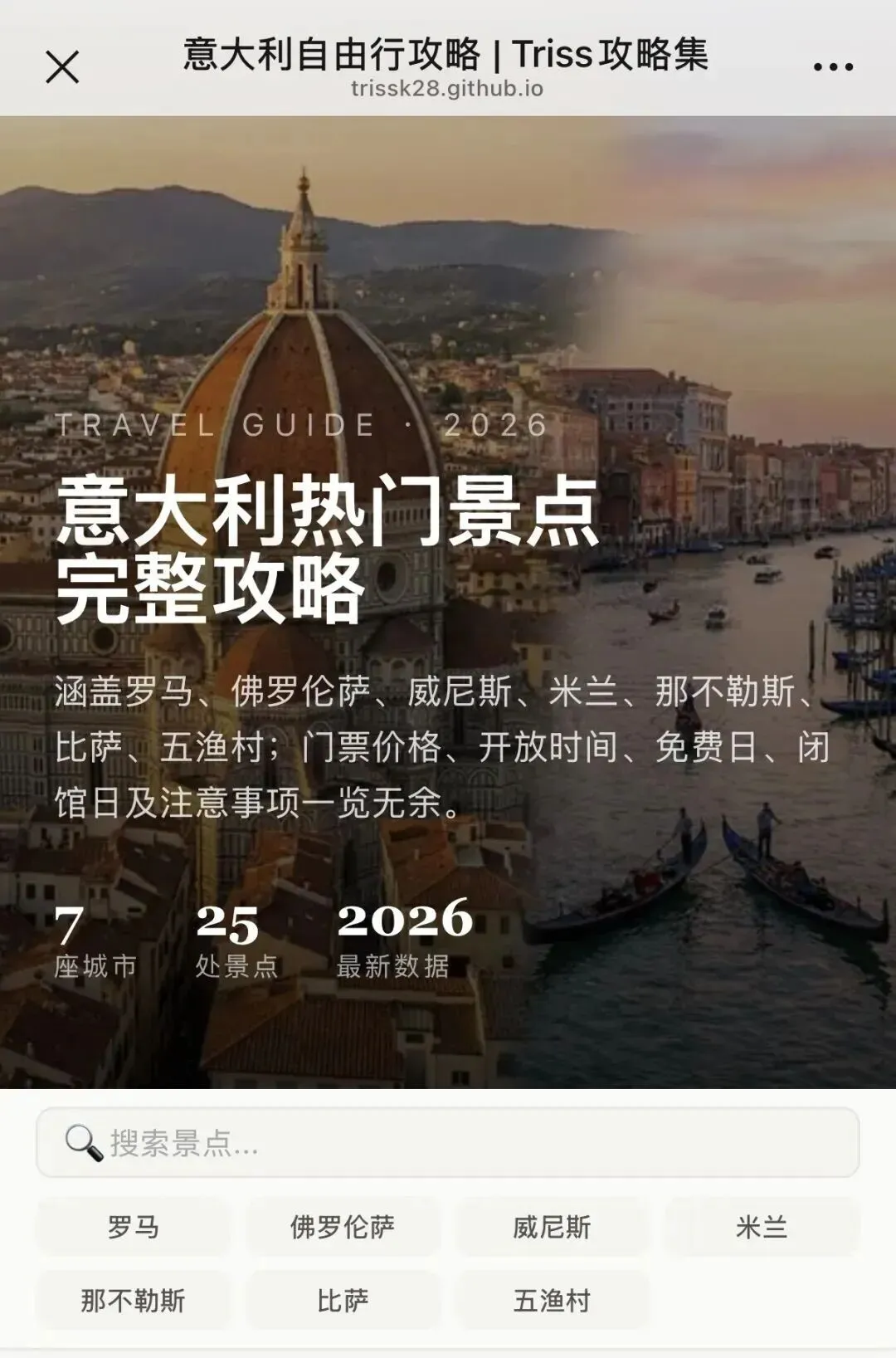 汇集了意大利 7 个热门旅游城市,共 25 处核心景点的攻略,所有数据均来自各景点官方网站,更新至 2026 年。