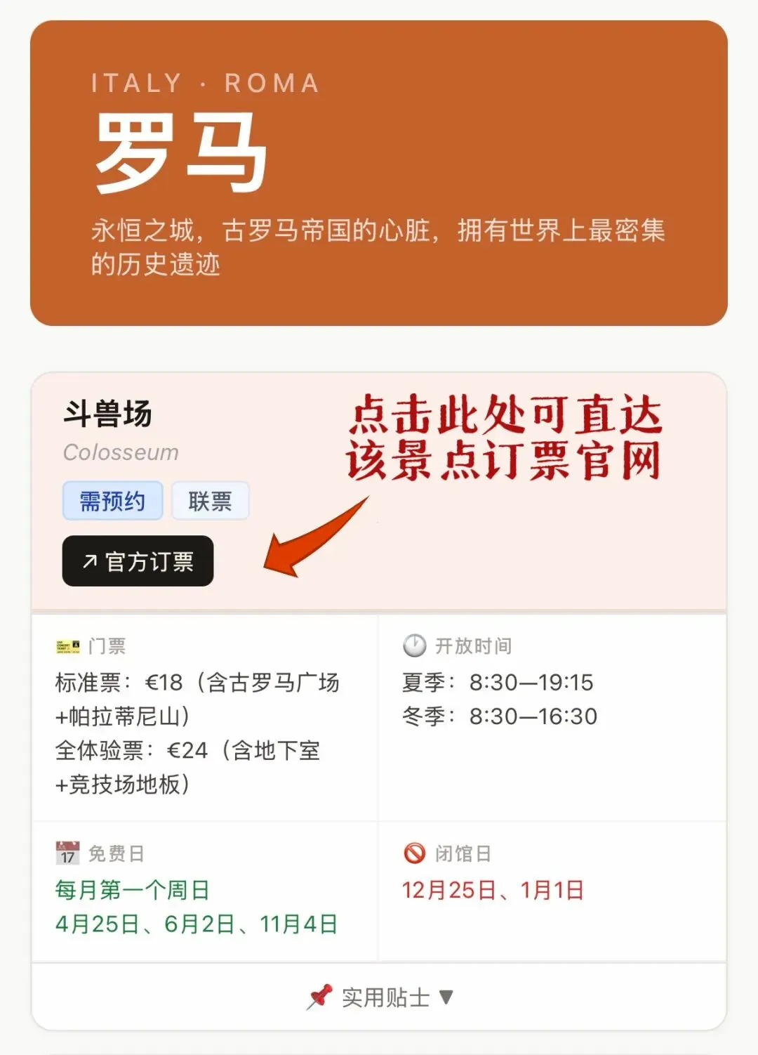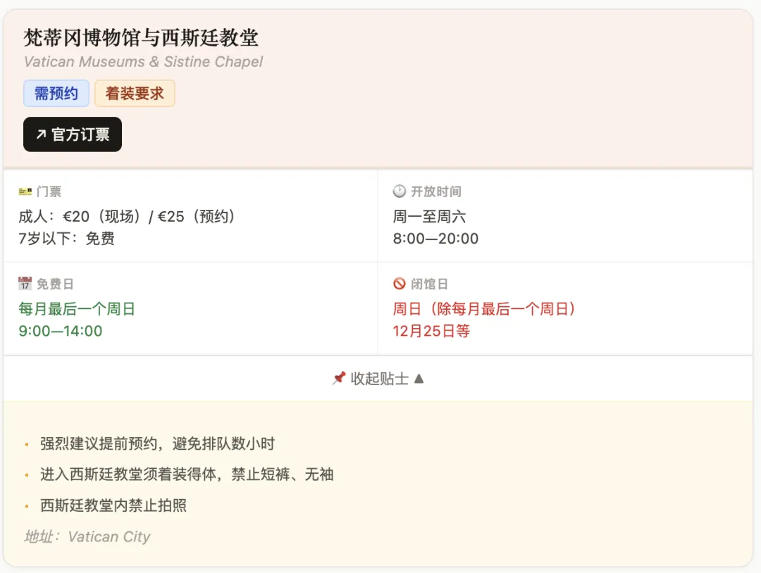 移动端是卡片式布局,每景点一个折叠卡片,点击 “📌 实用贴士 ▼” 展开注意事项与地址。