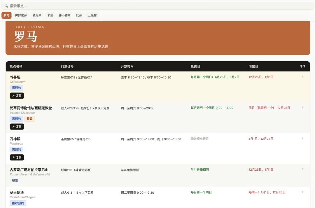 索性做了这个意大利自由行工具网站,将原本碎片化的热门景点官网信息高度集成,帮助大家高效便捷的规划行程、预订门票。