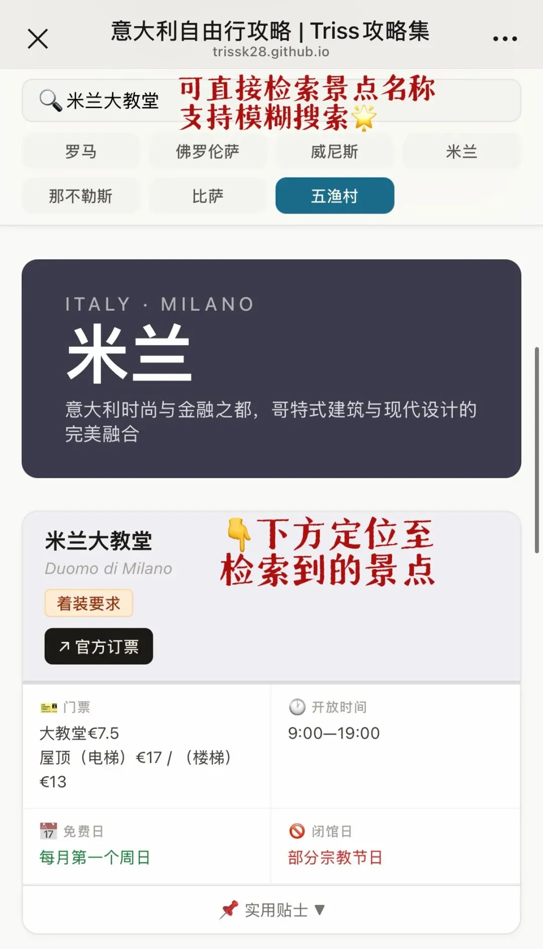 输入景点名称(如“斗兽场”“最后的晚餐”),页面会只显示匹配的景点卡片,其他内容自动隐藏;