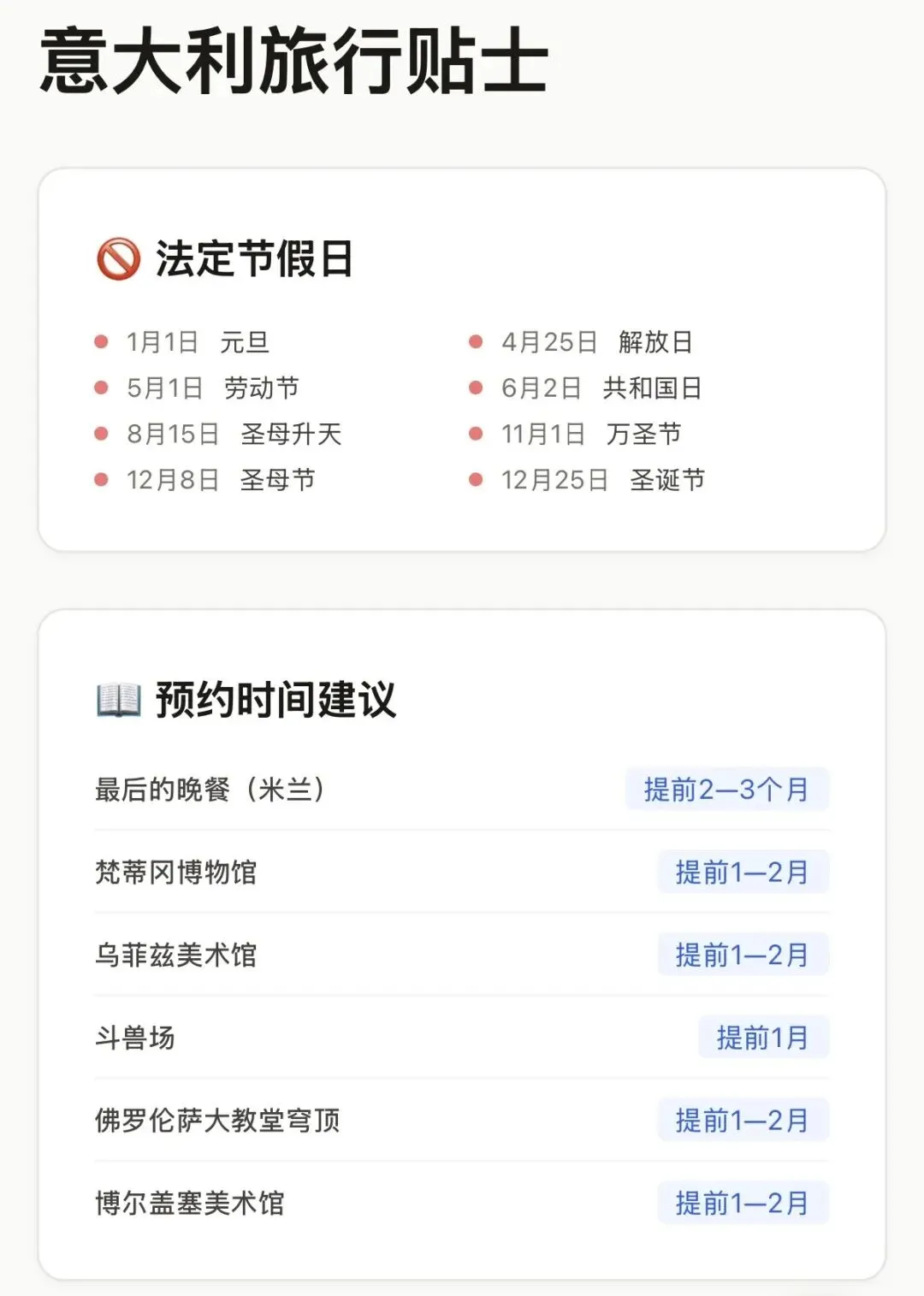 提前 2-3 个月:米兰《最后的晚餐》(全意最难抢)。