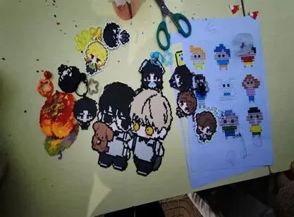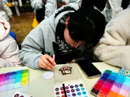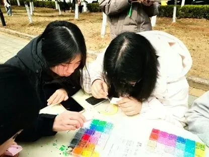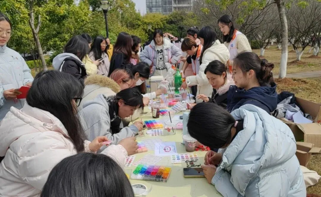 拼豆现场,工作人员详细讲解制作方法与安全注意事项后,女生们挑选心仪模板与色彩专注创作,相互交流、彼此援手,经熨烫定型,零散彩豆蜕变为精致手工作品,大家拍照留念,在创作中释放压力。