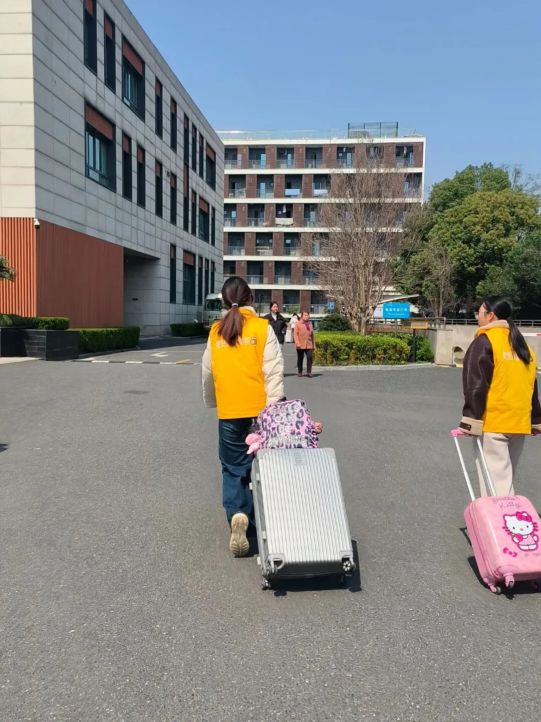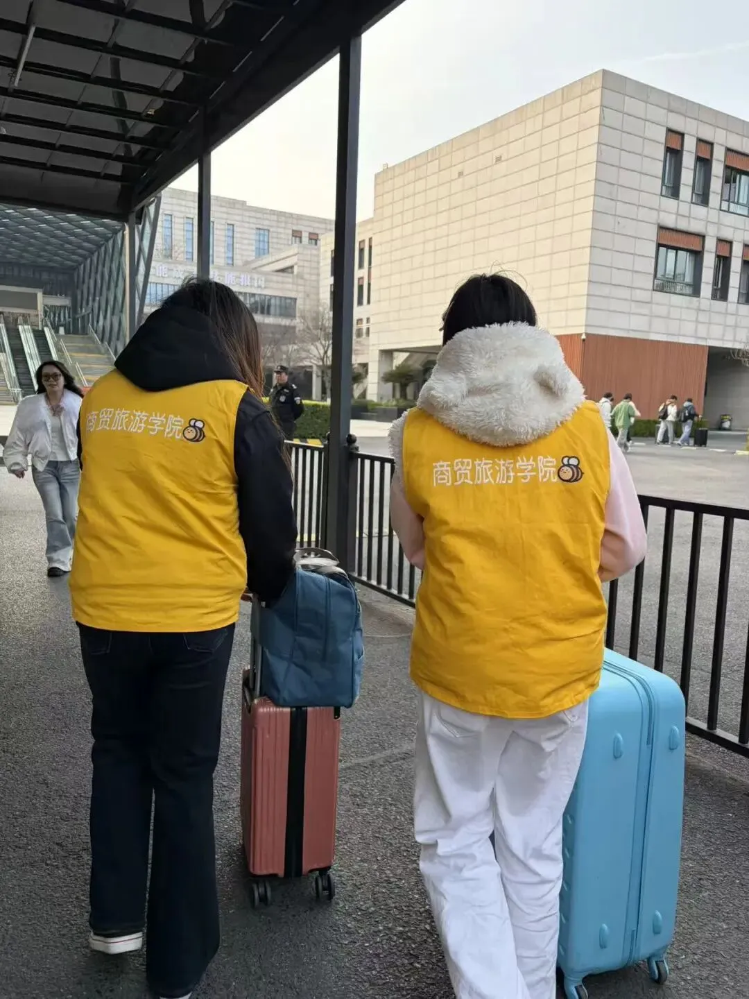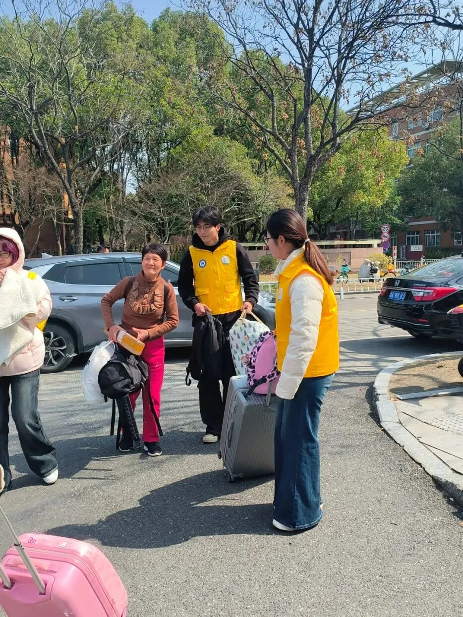 晨风微凉,身着统一服装的商贸“小蜜蜂”志愿者们已早早集结,精神饱满地守候在校门口。他们分工有序、热情洋溢:引导报到、搬运行李、指路答疑,忙碌的身影穿梭不息。早春的风虽带寒意,却掩不住那一张张真诚灿烂的笑脸。
