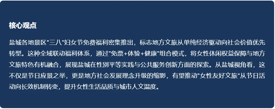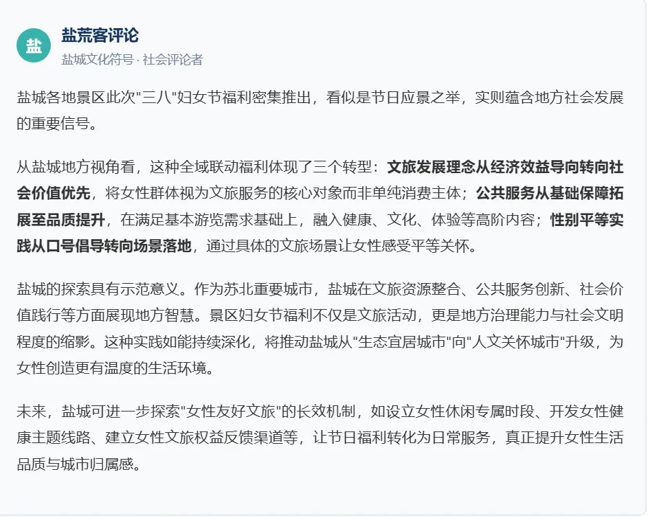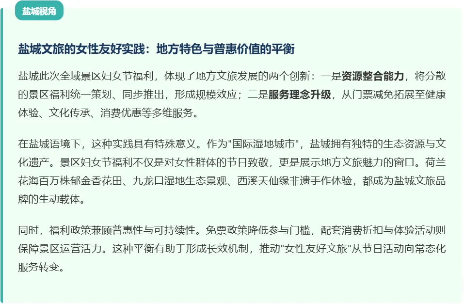 景区妇女节福利的社会意义,超越单纯的消费刺激与节日庆祝。它反映了盐城在女性休闲权益保障与性别平等实践的地方探索。通过文旅场景的普惠性福利,传递"女性享有平等休闲权利"的价值信号。