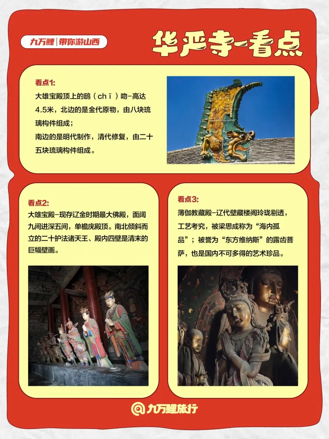 ▪️ 薄伽教藏殿(下寺):华严寺最古建筑(辽1038年建),国内仅存8座辽代木构之一,承袭唐风,殿内藏满国宝。