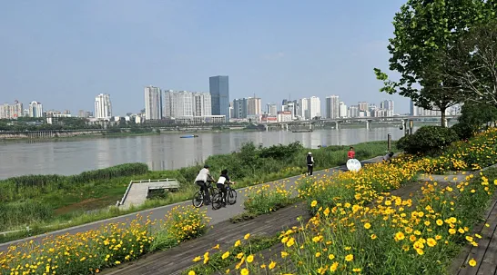 以休闲长廊和雕塑为主景,配以形式各异的小广场、景观小品、灯光亮化等配套设施,组合种植了多品种乔木和灌木,体现了江水两岸相互映衬的独特景色。游玩线路:黑石铺大桥,北至月亮岛北端。包括湘江八景,和新建的杜甫亭和各种雕塑、景观。