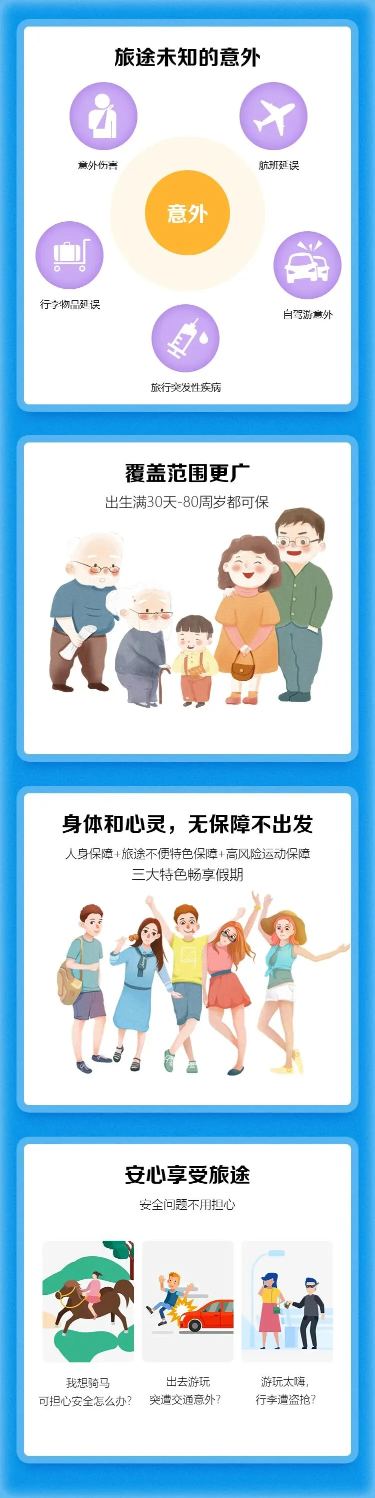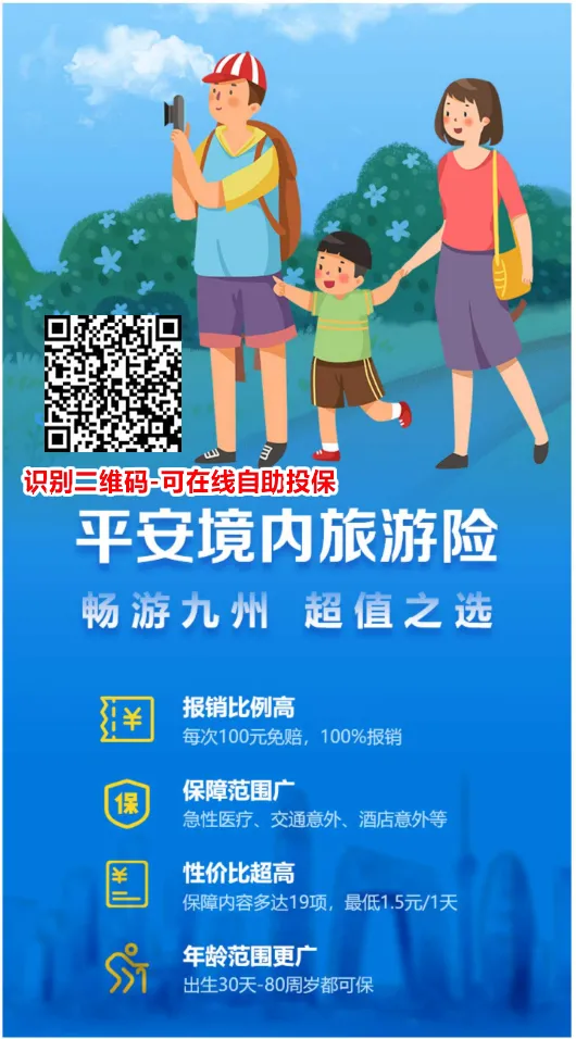 平安九州境内旅游保险:0-80岁可保,最高保额50万,含急性病/高风险运动/自驾游/交通意外/个人责任等,支持个人及单位团体投保