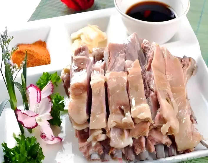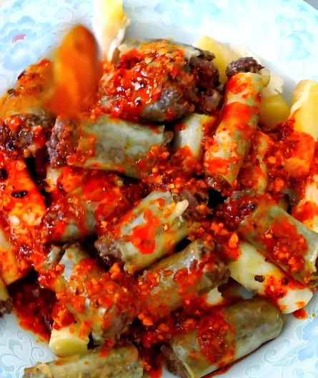 第三美食:发子面肠这道菜看着像艺术品,发子是羊杂碎做的,暗红色;面肠是面粉灌的,雪白色。切成片摆在盘里,红白相间,浇上红油、蒜泥、醋,看着就诱人。口感软糯,羊杂的香味和面粉的筋道完美结合,是下酒神器。