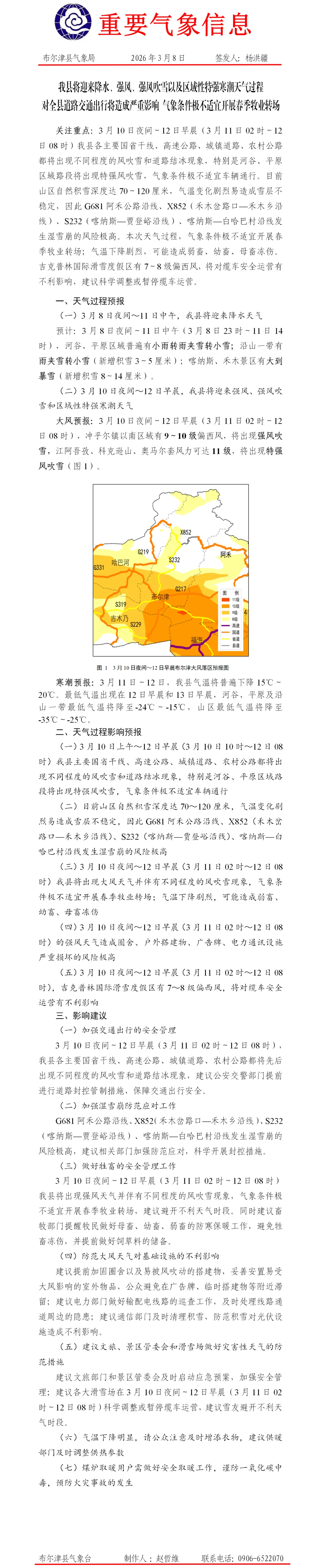 3月10日夜间~12日早晨(3月11日02时~12日08 时)我县各主要国省干线、高速公路、城镇道路、农村公路都将出现不同程度的风吹雪和道路结冰现象,特别是河谷,平原区域路段将出现特强风吹雪,气象条件极不适宜车辆通行。目前山区自然积雪深度达 70~120厘米,气温变化剧烈易造成雪层不稳定,因此G681 阿禾公路沿线、X852(禾木岔路口一禾木乡沿线),S232(喀纳斯一贾登峪沿线),喀纳斯一白哈巴村沿线发生湿雪崩的风险极高。本次天气过程,气象条件极不适宜开展春季牧业转场;气温下降剧烈,可能造成弱畜、幼畜、母畜冻伤。