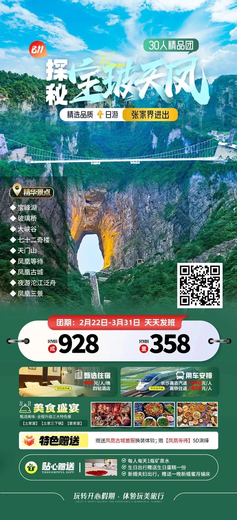 【B11张家界凤凰四日旅游】张家界参团:武陵源宝峰湖+张家界大峡谷玻璃桥+天门山+七十二奇楼+夜游沱江泛舟+凤凰古城纯玩4日游-天天发班