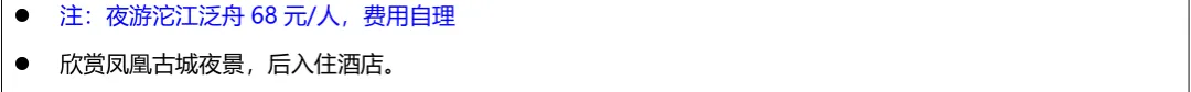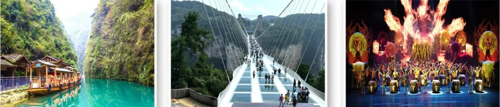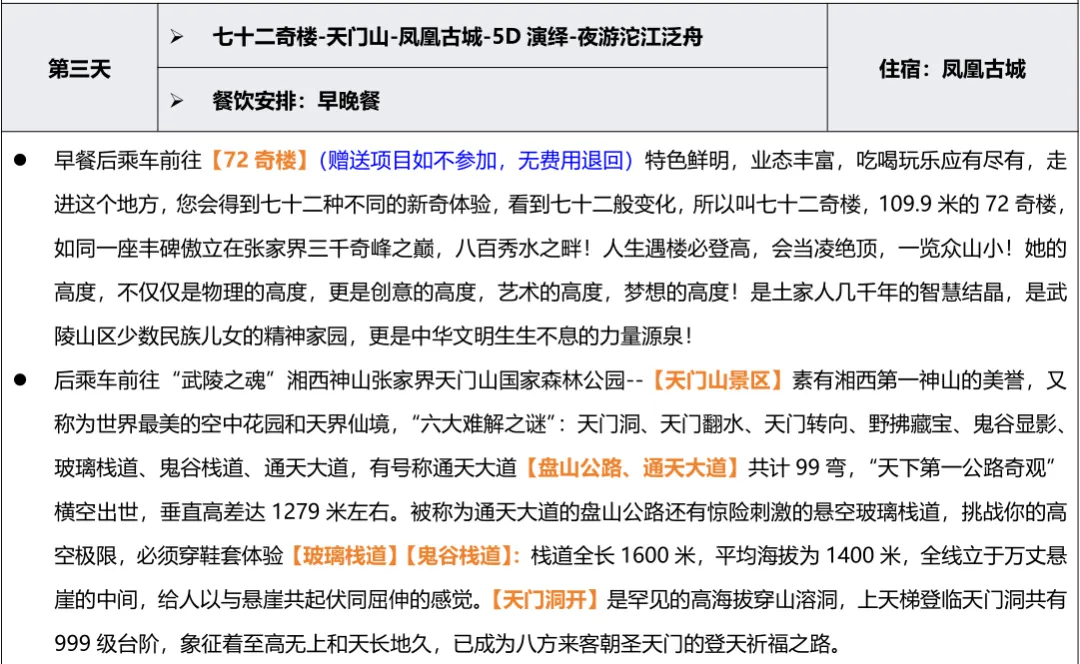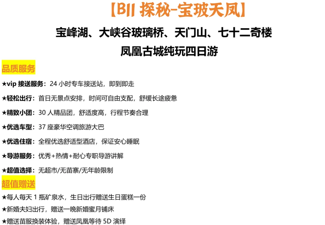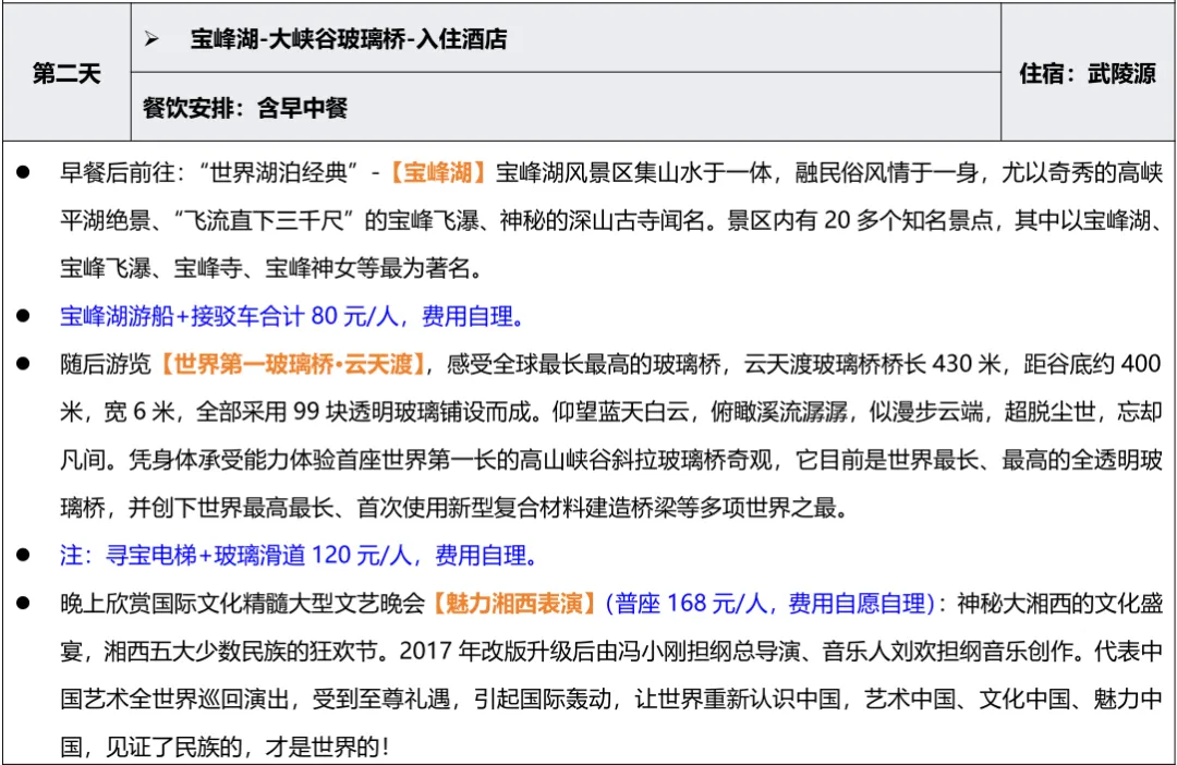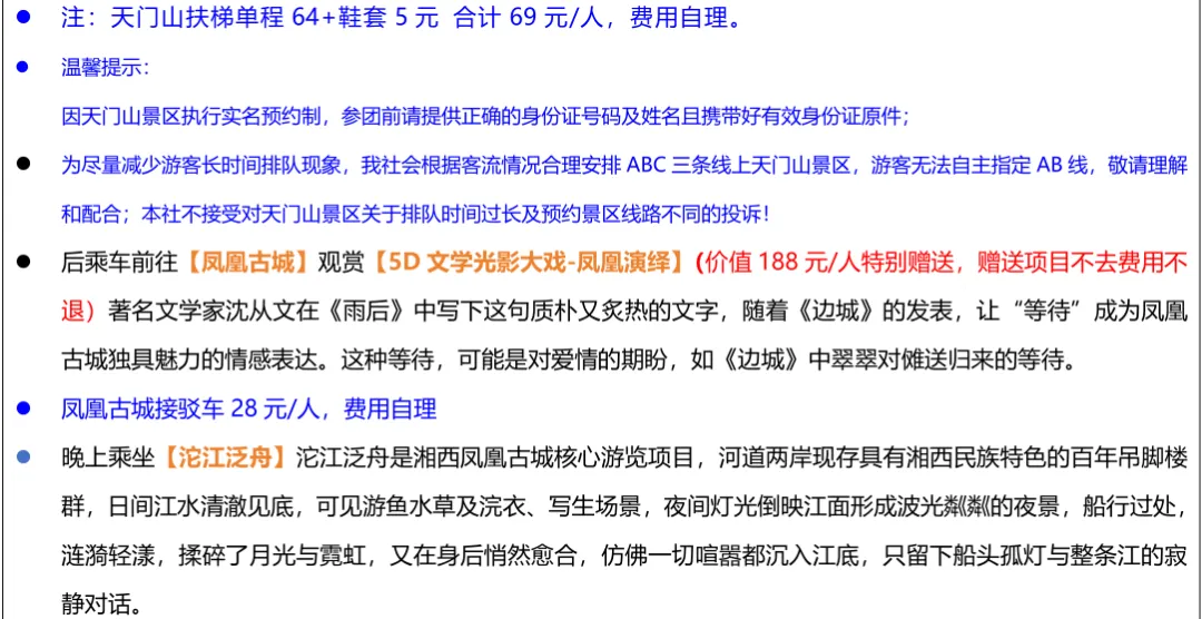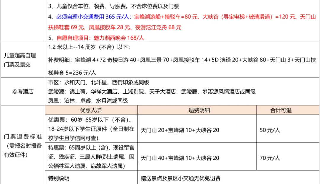 备注:成人需自理景区小交通365元(宝峰湖游船+接驳车=80元、大峡谷(寻宝电梯+玻璃滑道)=120元、天门山扶梯鞋套69元、凤凰接驳车28元、夜游沱江泛舟68元)