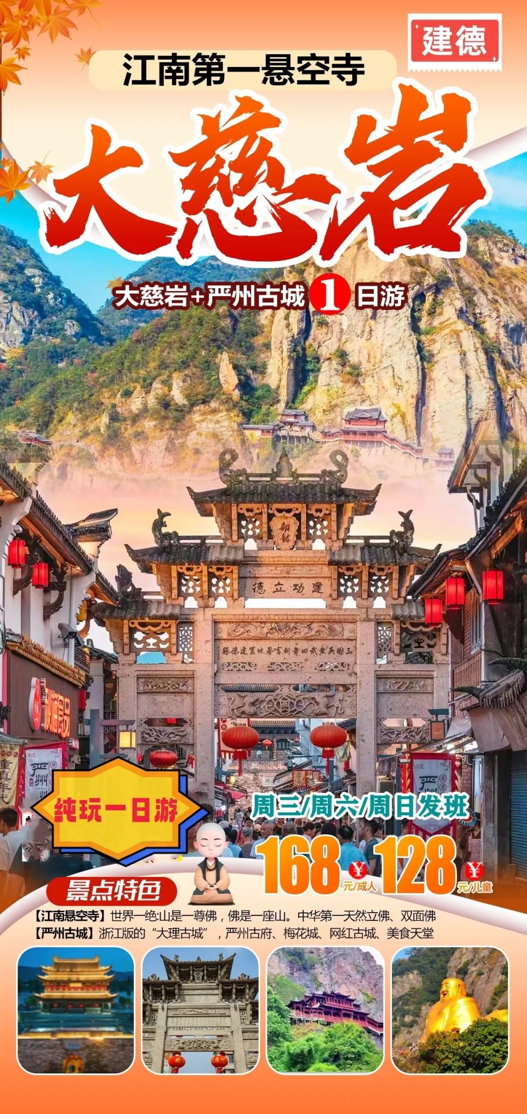 大慈岩风景区位于浙江省建德市大慈岩镇内,是一个佛教文化和秀丽山水完美结合的旅游胜地,素有“浙西小九华”之誉,以“江南悬空寺、长谷溪流、全国第一天然立佛”而名闻遐迩,是“浙江省风景名胜区优秀景点”之一。