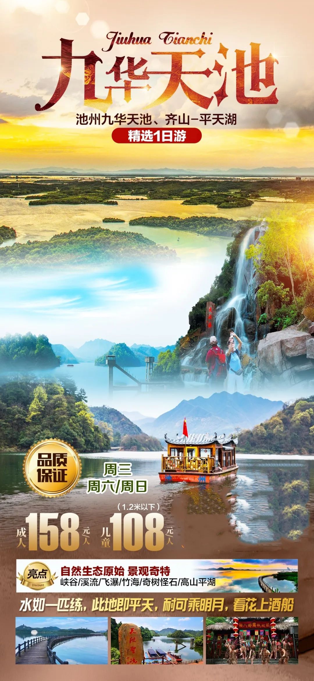 天池山水美天下,必须亲见才能得其韵味。到九华天池,看天池烟雨朦胧,玩惊险刺激空中漂流,赏水中飞人、矮人舞蹈,在山谷山洞间徒步穿行,登高俯瞰画里山河。