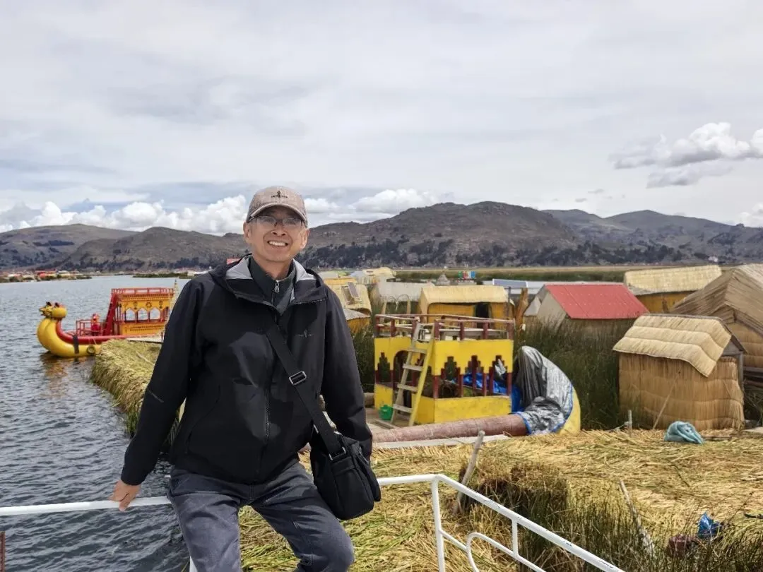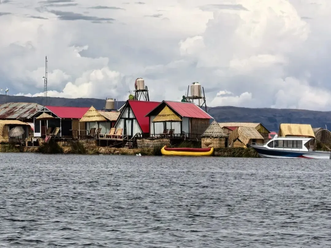 澄澈的湖水漾着细微波纹,托着由金黄芦苇堆垒而成的浮岛。岛上的房屋、瞭望塔皆由芦苇编织搭建,质朴的草顶在蓝天白云下愈显宁静;几点鲜艳的红、橙屋顶点缀其间,给原始的景致添了一抹亮色。码头边停泊着造型奇特的芦苇船,船头雕成神兽模样,米黄的船身衬着红褐色的装饰,仿佛随时准备载人驶向湖心深处。远处,安第斯山脉的轮廓在云层中若隐若现,与辽阔的湖面、低垂的云层连成一片,静谧中蕴藏着勃勃生机。