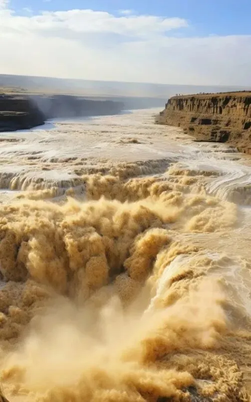 黄河壶口瀑布是中国第二大瀑布,世界上唯一金黄色瀑布,滚滚黄河水至此,500余米宽的洪流骤然被两岸所束缚,上宽下窄,在50米的落差中翻腾倾涌,声势如同在巨大无比的壶中倾出,故名“壶口瀑布”。