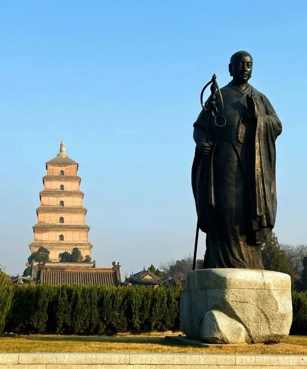 与玄奘纪念像合影留念,1500米中轴景观大道上的九组主题群雕立体展现大唐帝国在宗教、文学、艺术、科技等领域的至尊地位并彰显大国气象。