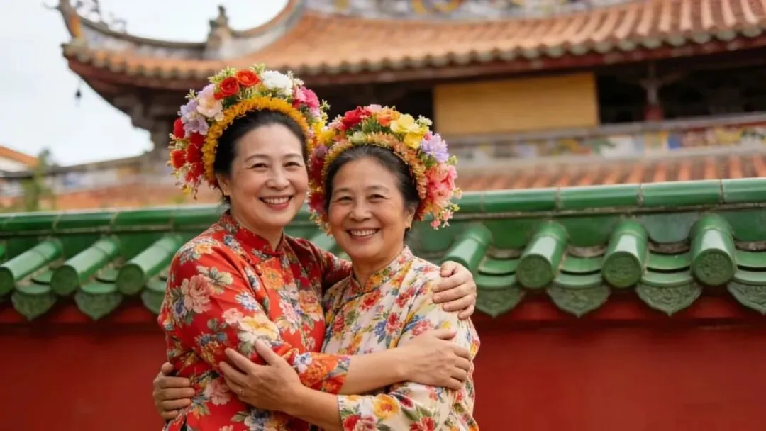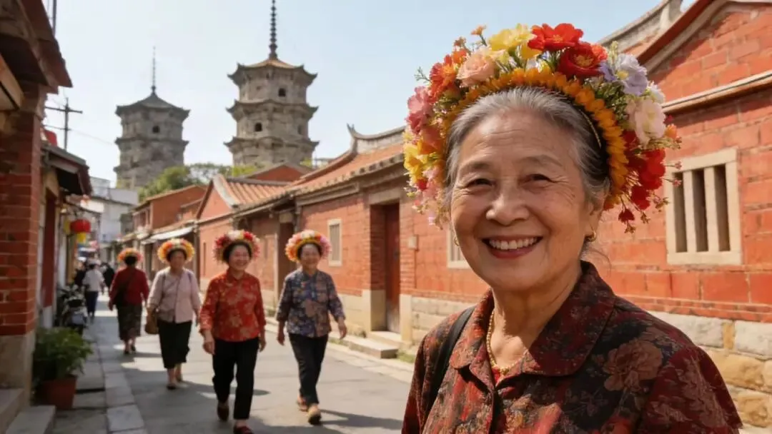 最后,去感受一下泉州的簪花,就是把鲜花盘在头上,换上当地的特色服装,在红墙下面一站就特别好看。咱们只是增长了年纪,一样可以漂漂亮亮的,把春天带身上。