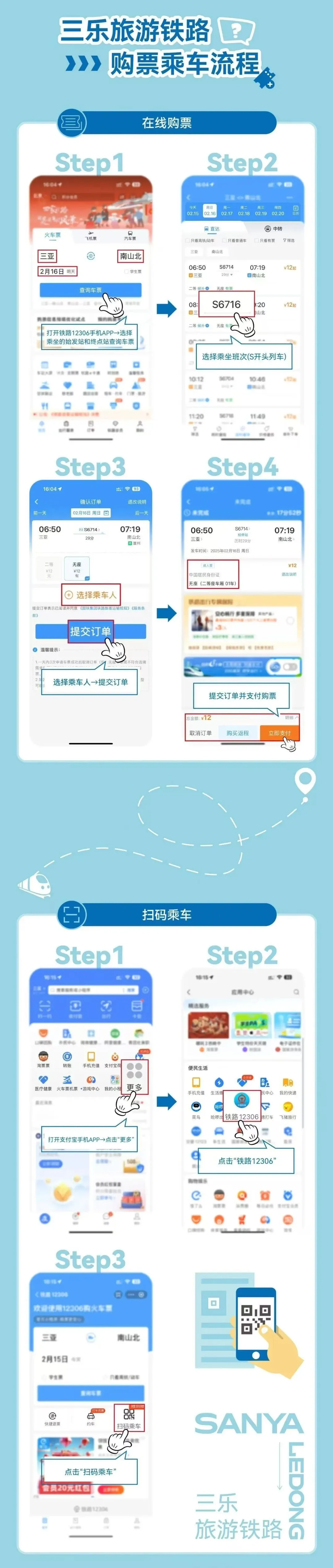 可在「海南南山文化旅游」微信公众号或景区观光列车售票处购票。