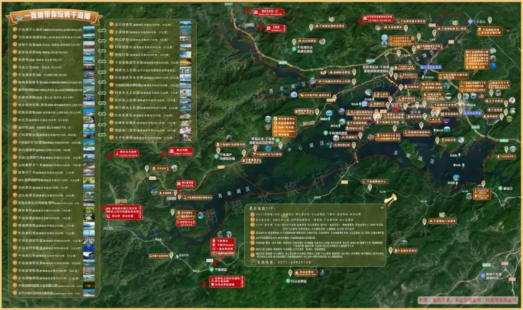 黄山尖:位于千岛湖东南湖区珍珠列岛内,主峰海拔 266 米。景区内有半山和山顶观景台,可乘坐索道上山。在山顶向西北俯瞰,九十多个岛屿排列成 “天下为公” 四个大字,堪称天下奇观。