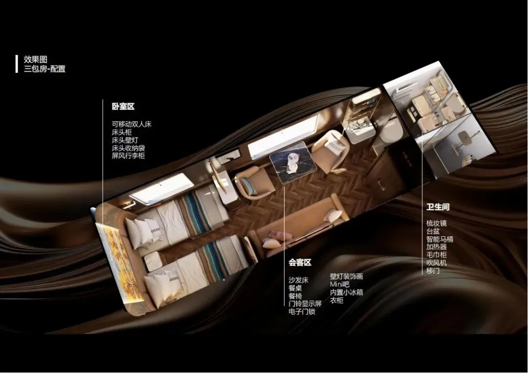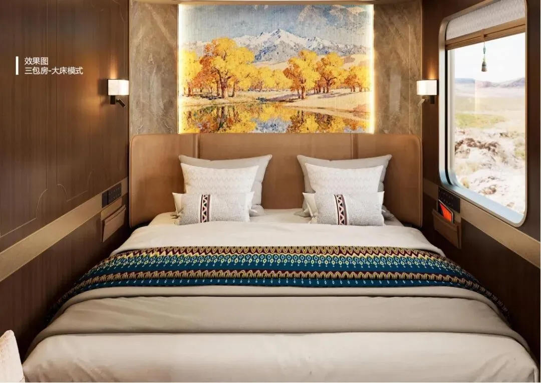 1:新东方快车三包房(6定员):以金色为主色调,寓意塔里木河边胡杨林的波涛与浩瀚沙漠的连绵细沙。包房内配置了可移动双人床、床头柜、沙发床、餐桌等设施,还有Mini吧、内置小冰箱、衣柜等便利设施。卫生间干湿分离,配备智能马桶、加热器、毛巾柜等,让旅客在旅途中也能享受到家一般的舒适。