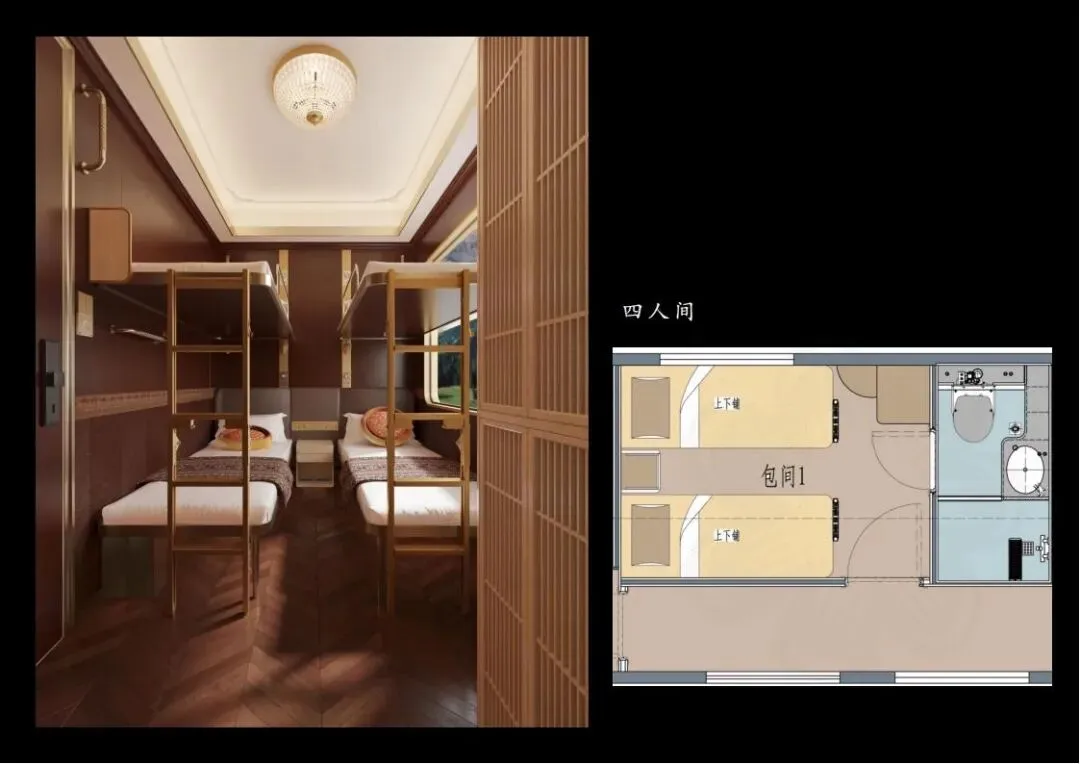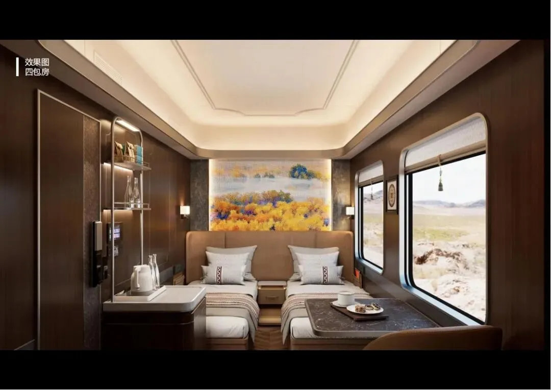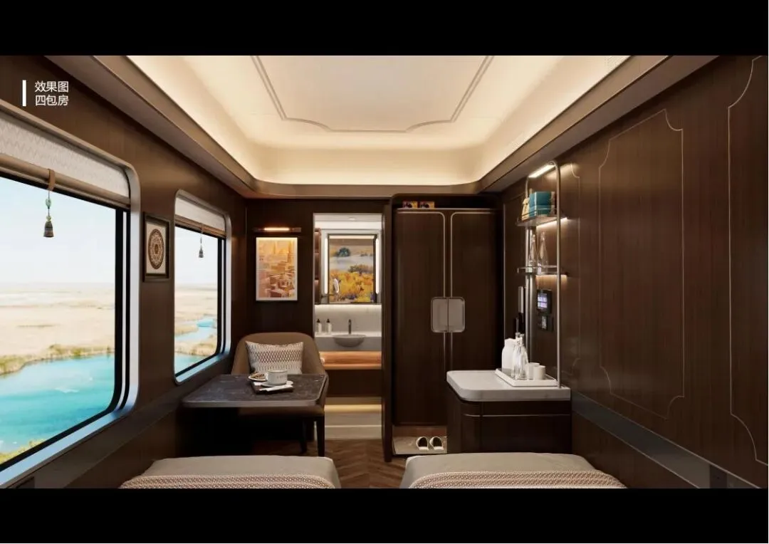 2:新东方快车四包房(8定员):以银色为主色调,象征昆仑山脉下和田美玉的温润莹洁。包房内同样配置了可移动双人床、床头柜、沙发床、餐桌等设施,以及Mini吧、内置小冰箱、衣柜等。卫生间设计同样考究,干湿分离,配备智能马桶、加热器、置物柜等,为旅客提供极致的舒适体验。
