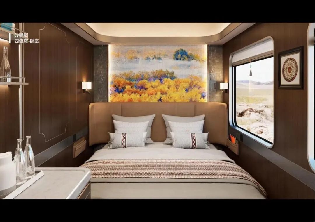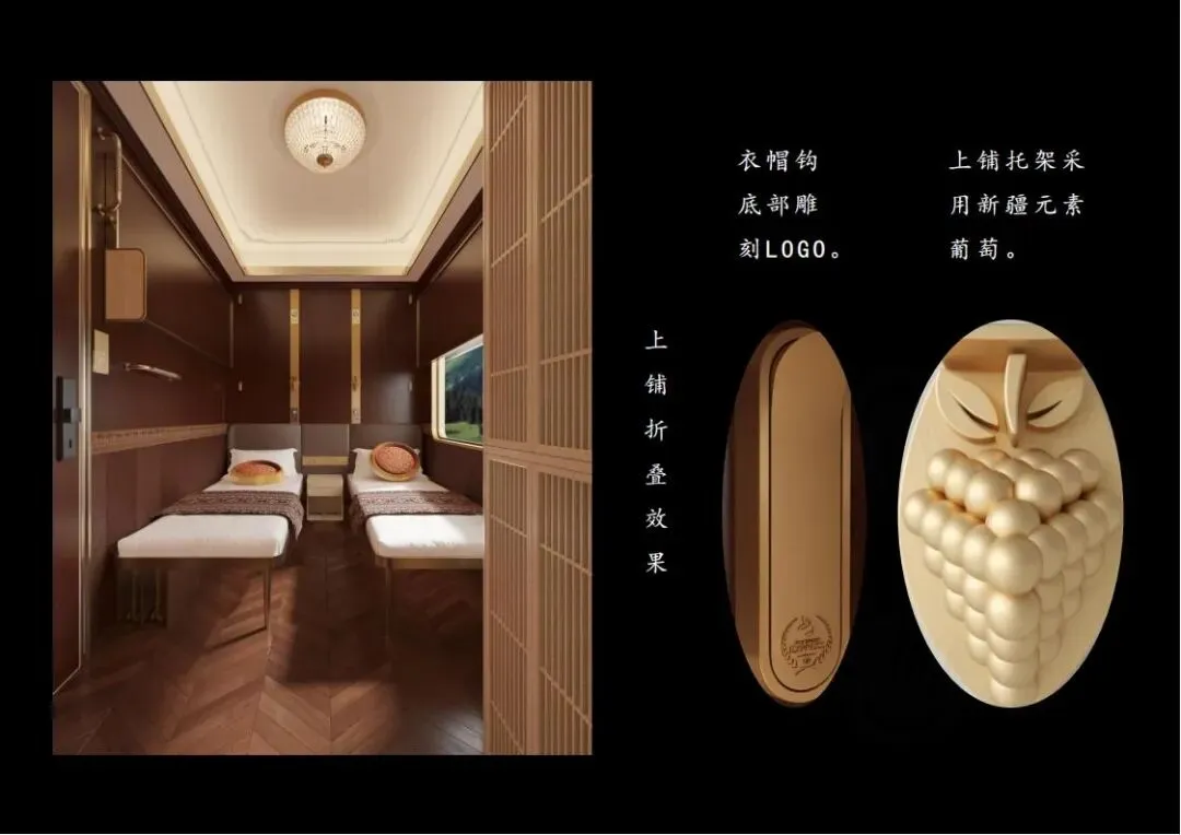 3:新东方快车五包房(10-20定员):深度植根于丝绸之路的历史文化脉络,以沙漠、驼队、山峦为景观符号。包房内配置了上铺托架(采用新疆元素葡萄装饰)、衣帽钩等细节设计,以及干湿分离的卫生间,让旅客在旅途中感受到浓厚的历史文化氛围。