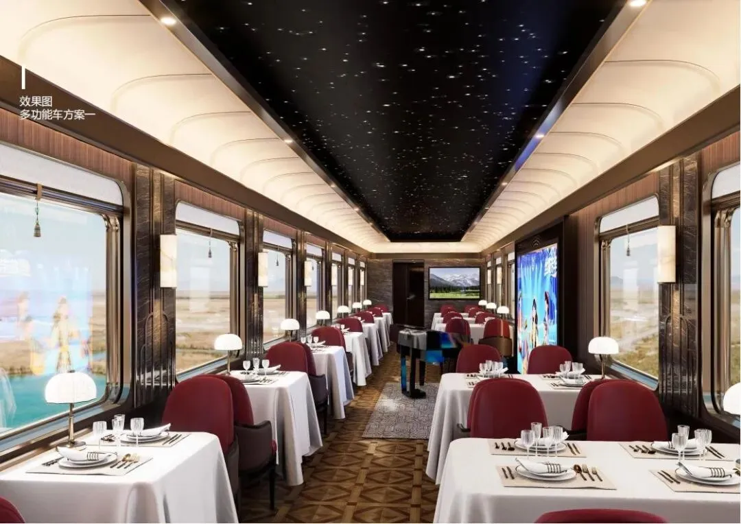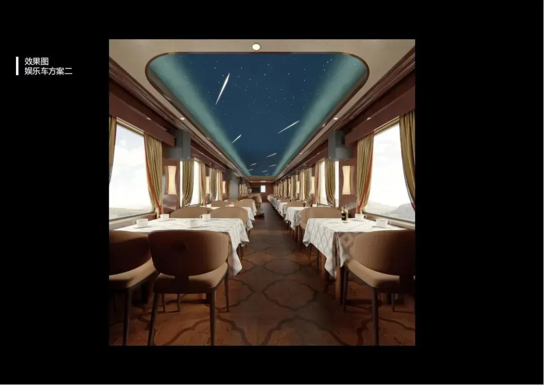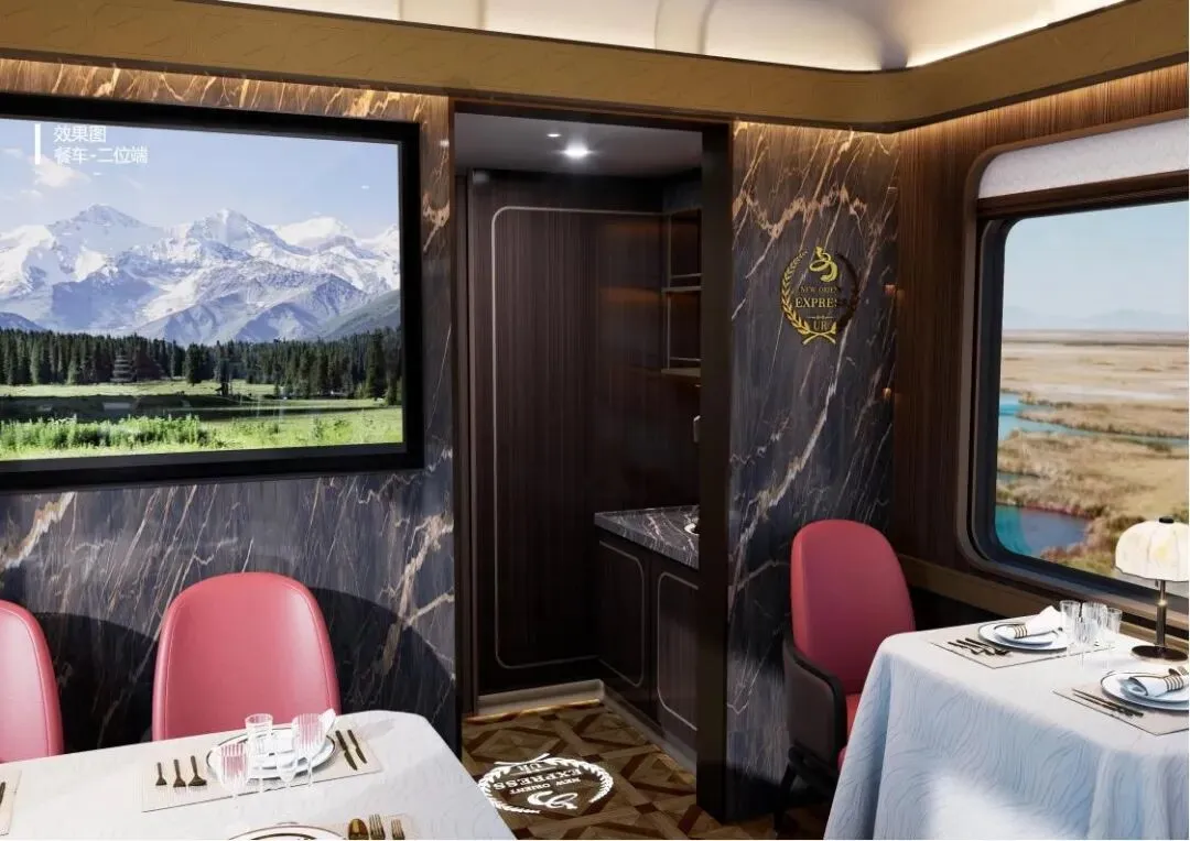 餐厅车:穹顶设计为阿克塔斯草原的星夜,营造出浪漫而神秘的用餐环境。餐车内提供米其林级别的美食体验,让旅客在品尝美味的同时,也能欣赏到窗外的美景。