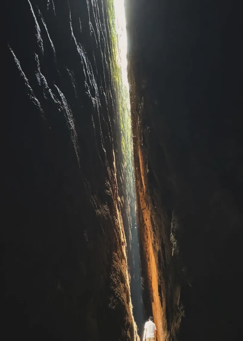 一线天位于武夷群峰西南端九曲溪二曲南面的峡谷中,主体为灵岩覆盖的三个毗邻岩洞:左为灵岩洞,中为风洞,右为伏羲洞。岩顶裂缝长约100多米,宽不足一尺,形成漏入天光的自然奇观。该景观由红色岩层经地壳抬升产生垂直节理裂隙,后经流水长期侵蚀形成。