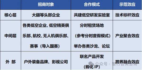 低空主题酒店(含停机坪客房)、云端餐厅(悬空透明包厢)、低空主题文创商街(低空航模/低空飞行装备零售、配件销售、IP衍生品创作及售卖)