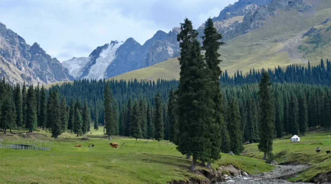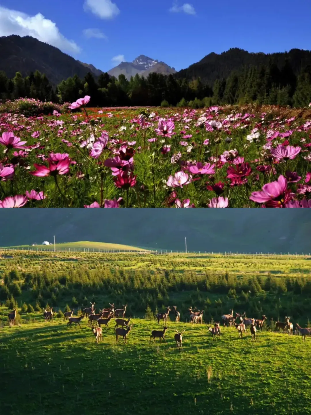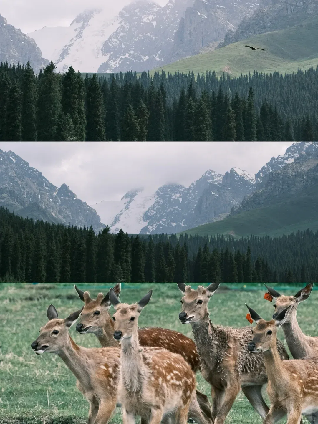 这里牧草丰茂,远处雪峰轮廓清晰,草原、森林、溪流衔接自然,视野无遮挡,能完整捕捉开阔的空间感。