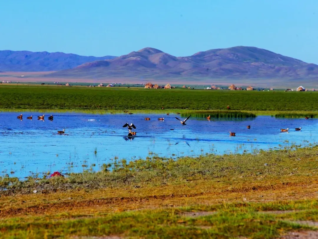 沙孜湖似一条淡蓝色的绸带,柔美秀丽,牛羊如云,毡房点点,来这里,可以充分体验回归自然的浪漫情怀。
