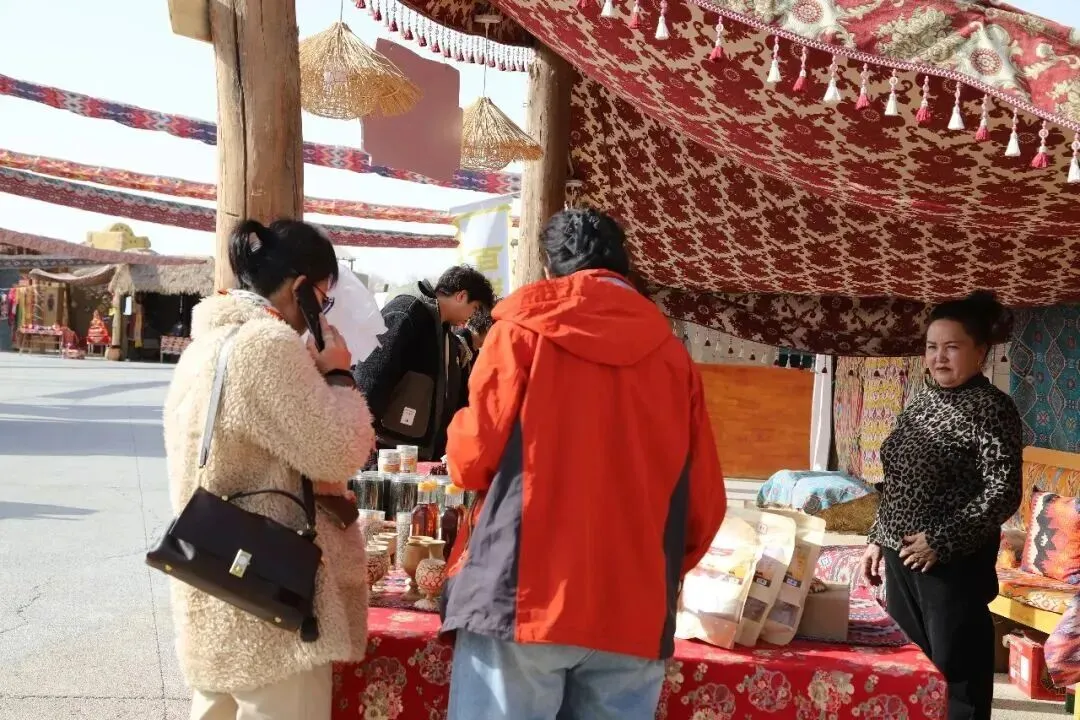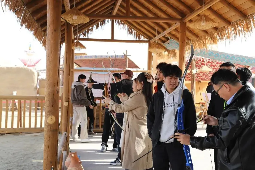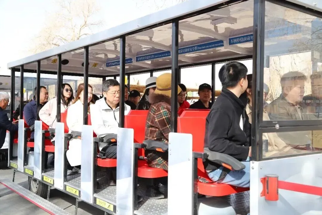考察团乘坐特色小火车抵达阿不旦广场后,沉浸式感受景区场景构建与多元业态的深度融合。丝路巴扎市集再现古丝路商贸风貌,长史府、大漠引弓台、太阳餐厅等新节点充分展示业态升级后的生机活力。代表们沿途与工作人员深入交流,详细了解丝路文化展示、市集运营模式及游客动线设计,对景区“可观、可玩、可购”的一站式体验模式表示肯定。