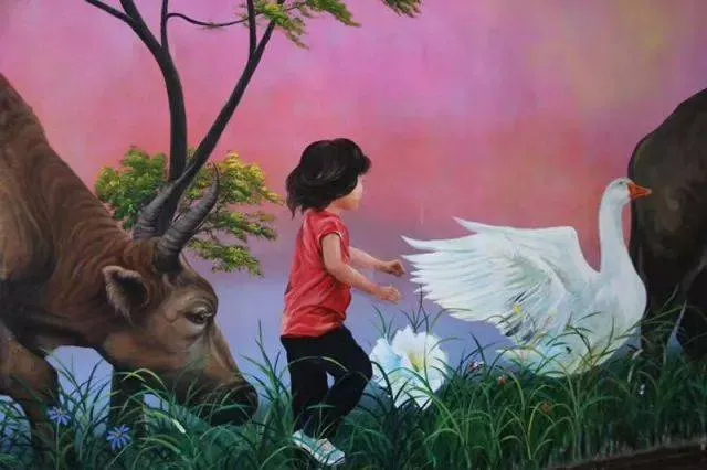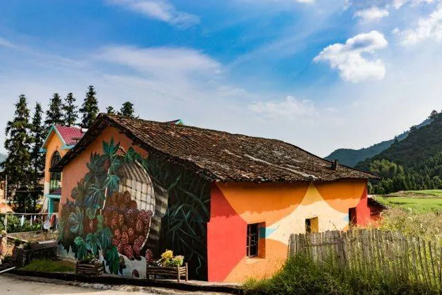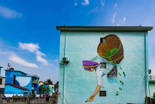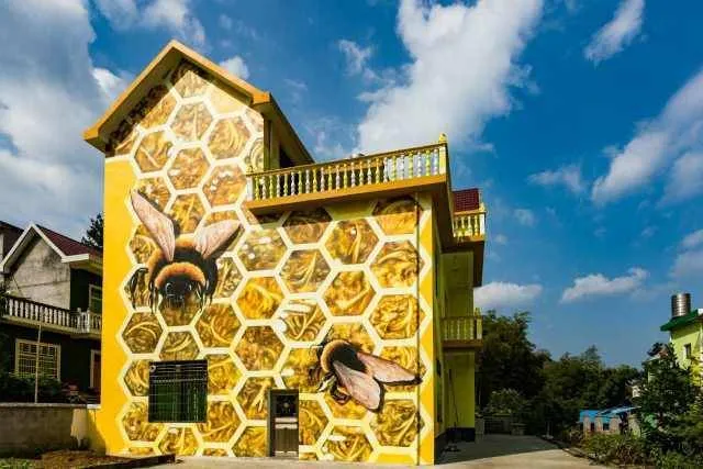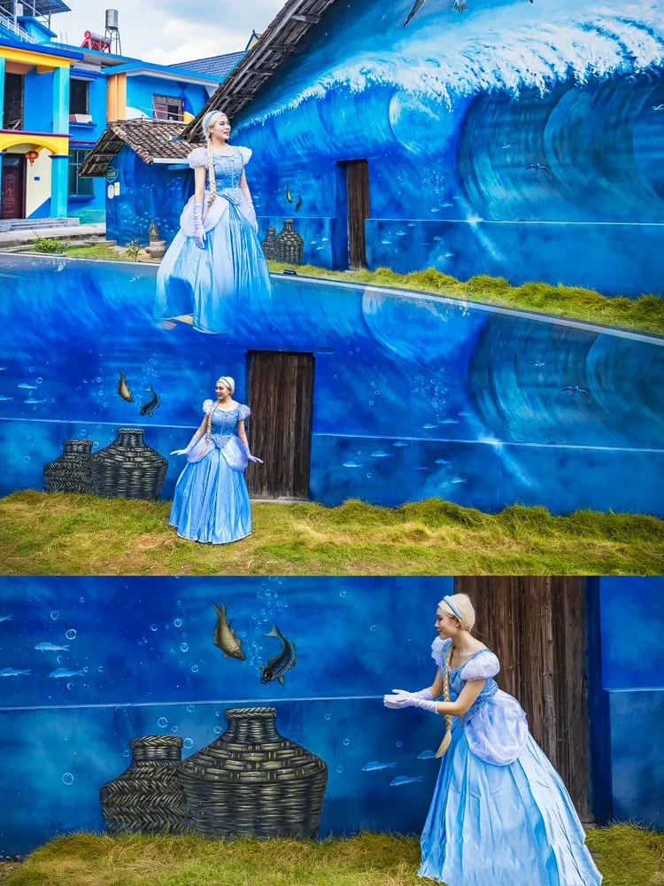 彩色的小屋林立在绿色的田野之中,近处的稻草堆上也被绘上了栩栩如生的海豚,仿佛在田野里翻滚嬉戏。