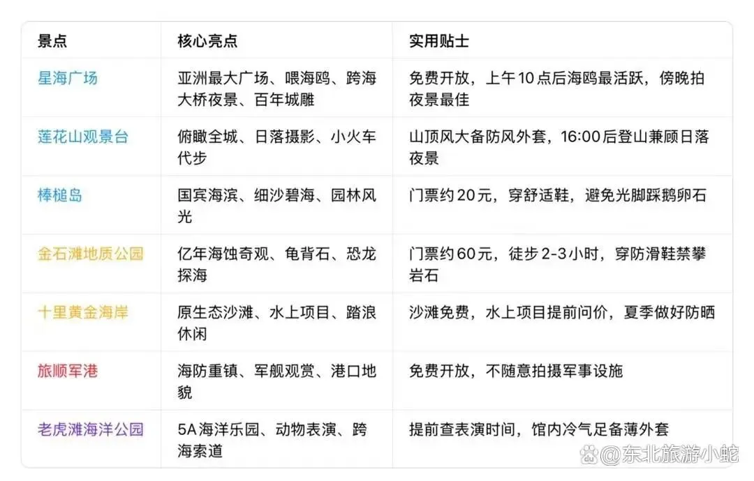 城市景点呈 “一核三片区” 分布:市区核心(星海广场、莲花山、棒槌岛、老虎滩)主打城市海景与休闲;金石滩片区(东部远郊)以亿年地质奇观、海岸休闲为主;旅顺片区(西部近郊)承载百年军港历史,三条线路不折返,游玩效率拉满。